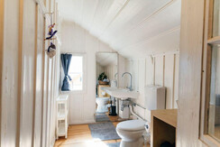 Two bathrooms and a spacious entrance area with storage space complete the offering. The garden with a sunbathing lawn and large wooden terrace invites you to relax; pets are welcome.