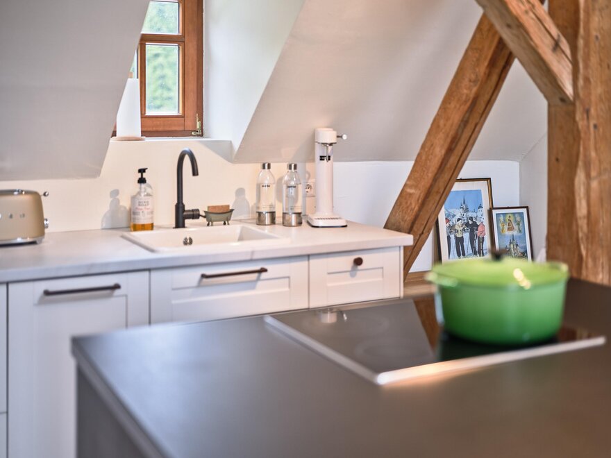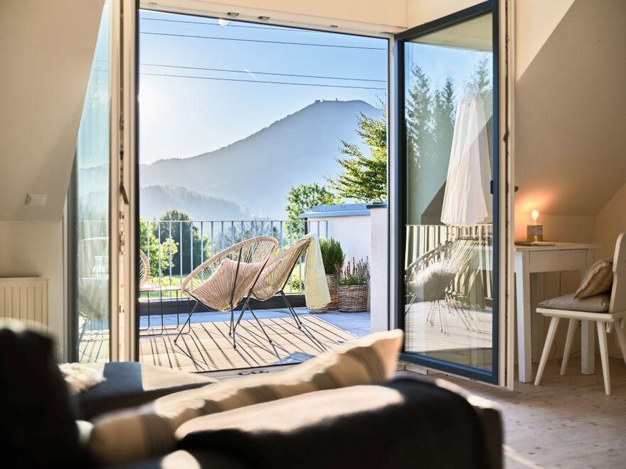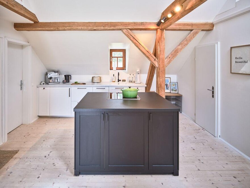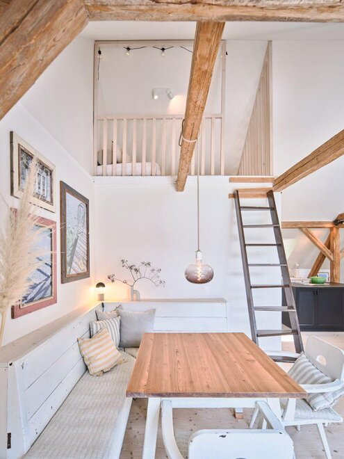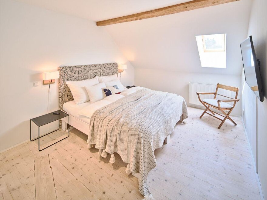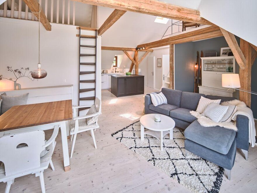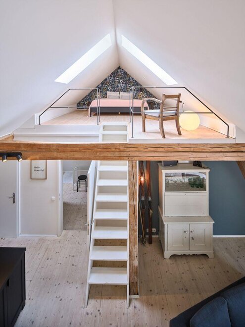 The approximately 70 m² holiday apartment is located on the 1st floor and can accommodate 1 to 5 people. It is furnished with great detail and has all the amenities you need for a comfortable stay. The apartment comprises a bright, open-plan kitchen with a cosy dining area and gallery, a bathroom with shower and toilet, a practical storage room and a washing machine. The separate bedroom is furnished with a double bed. The gallery offers additional sleeping space with a double bed, and there is also an optional single bed on a second gallery level. A special highlight is the spacious balcony with a magnificent view – perfect for enjoying nature and simply relaxing!