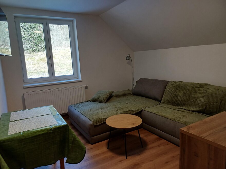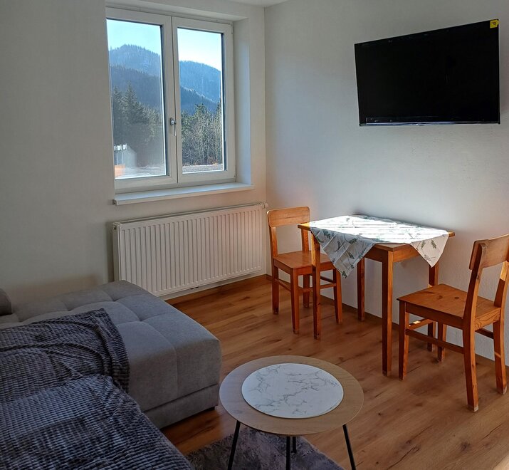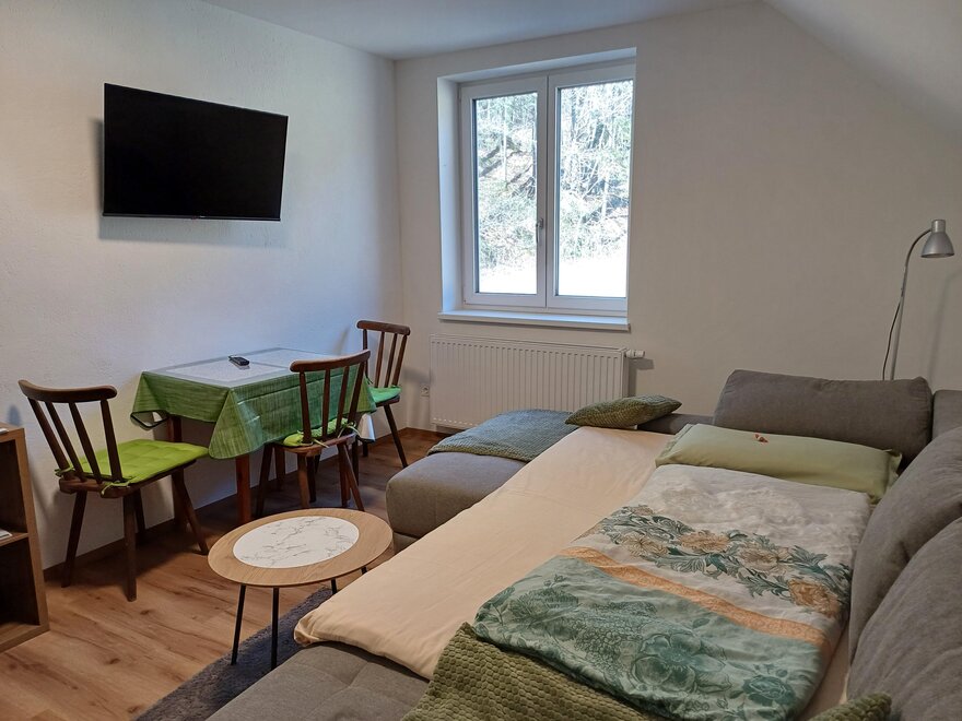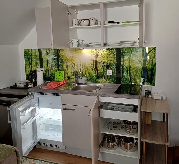 The fully equipped apartment consists of a bedroom with a double bed and a living kitchen with a pull-out sofa bed for a maximum of 2 people, with cooking facilities for self-catering.