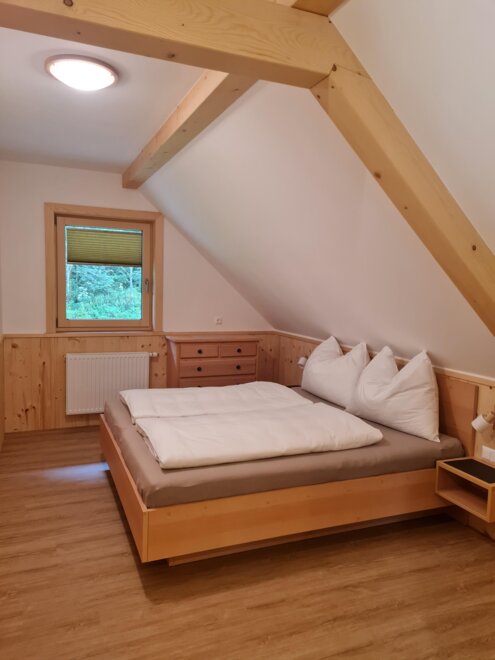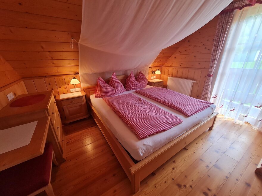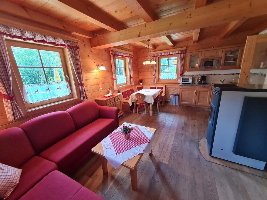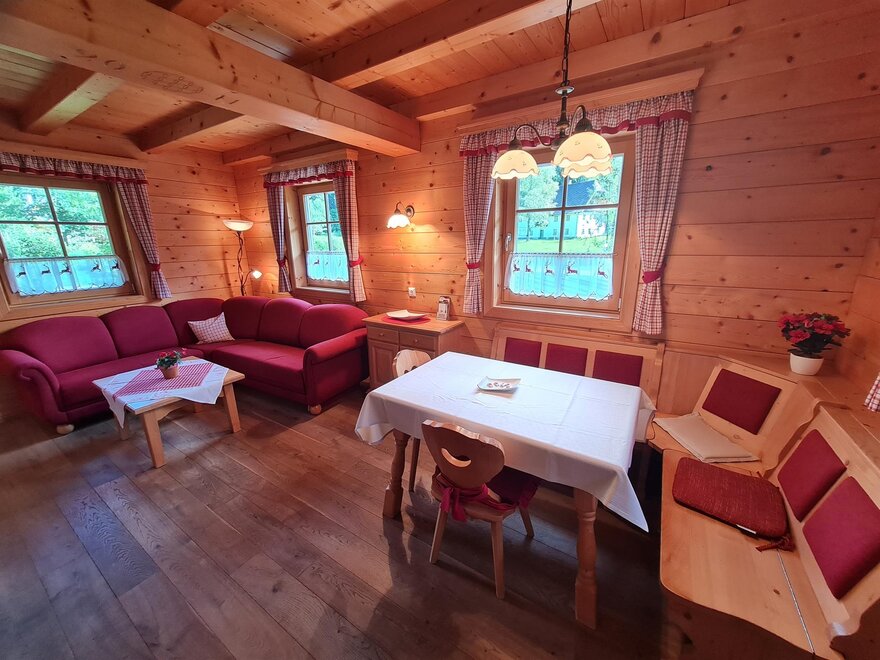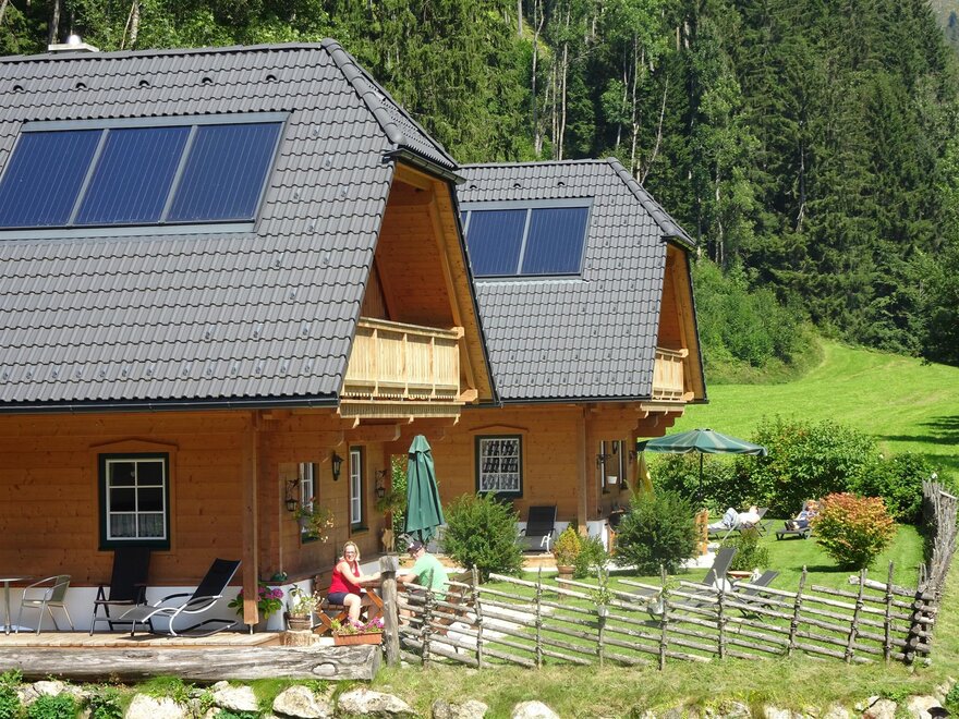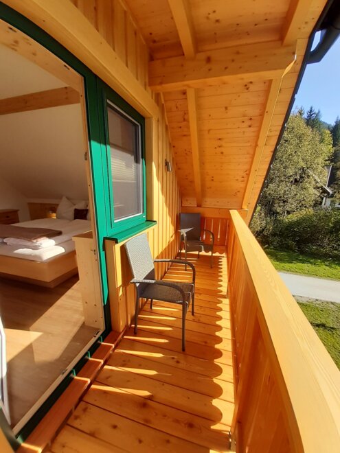 Our romantic log houses (82 sqm) have a living room with SAT-TV, kitchen, two romantic double rooms with balcony, bathroom with