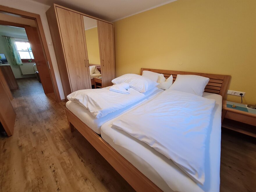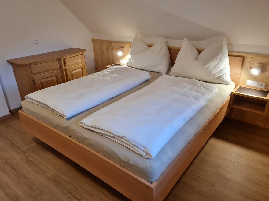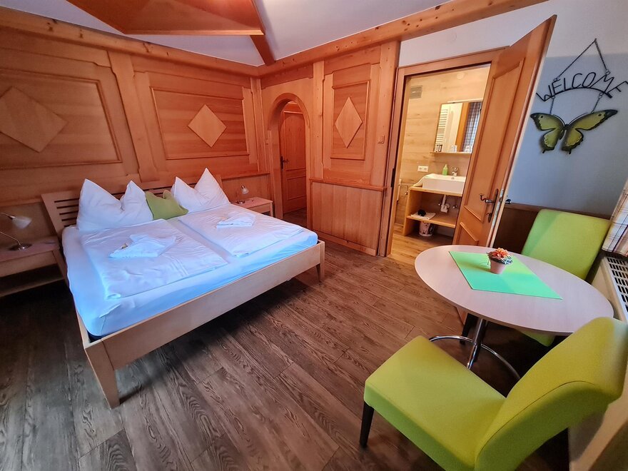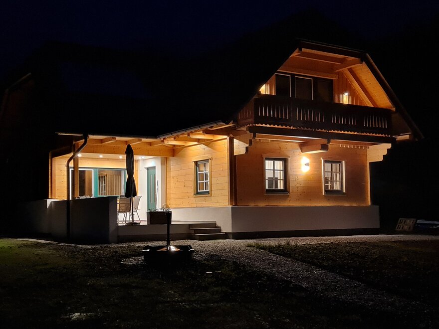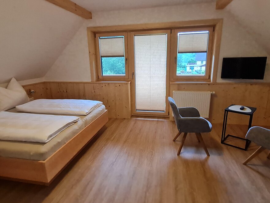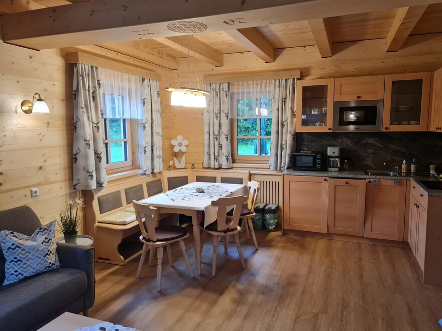 Our romantic log houses (82 sqm) have a living room with SAT-TV, kitchen, two romantic double rooms with balcony, bathroom with