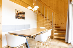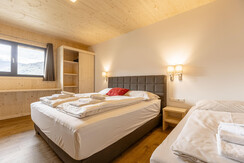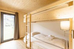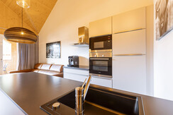 With 140m² of living space, up to 10 people can be accommodated. The exclusive Deluxe holiday home features an outdoor jacuzzi, sauna or infrared sauna, five bedrooms, and three bathrooms with shower and toilet (hairdryer available). The spacious living-dining area is equipped with a cozy seating area and flat-screen TV. The open kitchen in the accommodation is fully equipped: cutlery and (cooking) dishes are provided, as well as a ceramic hob, oven, dishwasher, and refrigerator with freezer compartment, along with a toaster, kettle, and coffee maker. A small ALPS RESORTS starter set with dishwasher tabs, dish soap (sample), sponge, trash bags, cleaning cloth, and dish towel is ready for you upon arrival. Wi-Fi is free, satellite TV. All images are sample images. Each chalet is individually furnished.