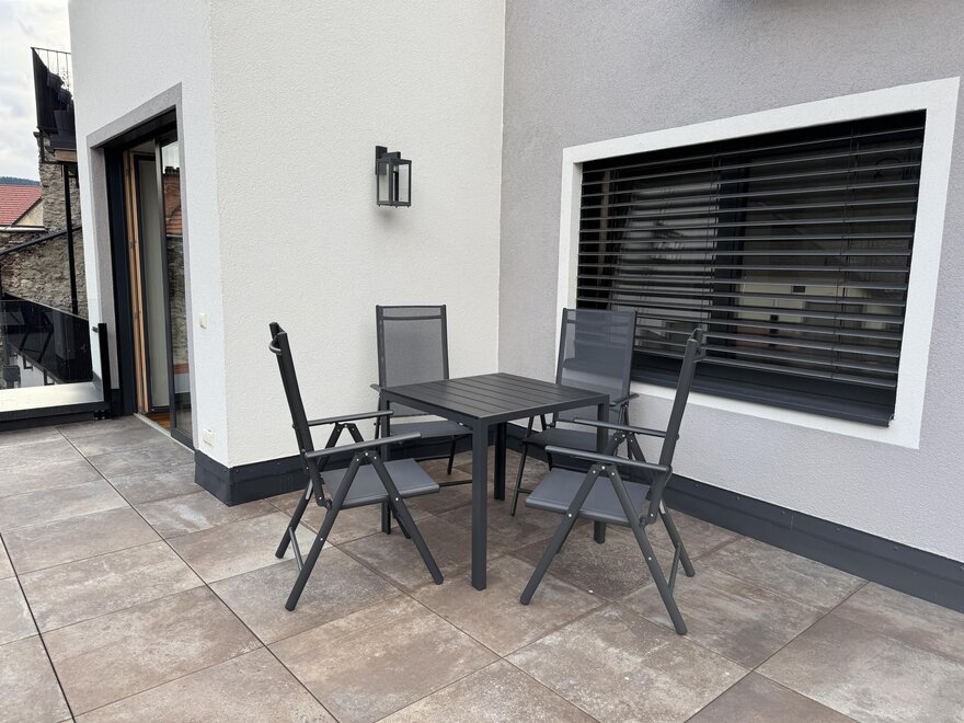The "Stein Reich" vacation apartment is divided into two floors: on the first floor there is the living/dining room, a separate, fully equipped kitchen with electric stove, dishwasher and fridge, an anteroom and a WC.