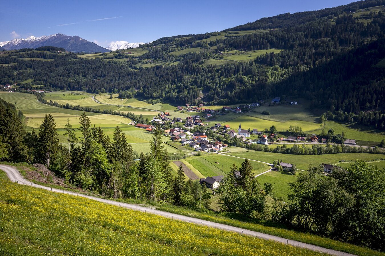 From the starting point S3, walk towards the Althofen fire station, turn right there and walk uphill towards the Klein- and Großsteiner farms. From there, continue to the Krenold farmstead, which offers a magnificent view of the valley. Then follow the gravel path for a while, which then turns into an asphalt road until you reach Mühltratte. From here, continue along a forest and meadow path to the Buttererkreuz. Then turn right onto the road and continue straight ahead until you reach the Schwarze Sau intersection. At this intersection, turn left and walk downhill for a short distance to the forest path, past the Luagtrattner farmstead, on to the Trattner inn and on to St. Peter am Kammersberg to the parish house. From there, follow the signs via the Kirschsteig to the main road and on to the Katschbach. Passing the Volz mill, a forest path (gravel path) leads to the Speckbauer am Glanz. The forest path continues to the Handl farm, and the descent leads towards Peterdorf via the Kleinburger farmstead along a forest and meadow path to Peterdorf. Once you reach the village, keep to the right and hike along the Katschbach stream back to the starting point.