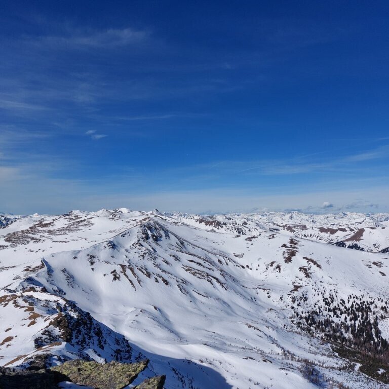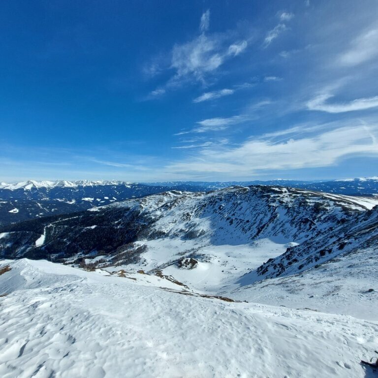 The descent mostly follows the ascent route. Wide slopes offer smooth skiing, but require stable snow conditions. In the lower section through the forest, the descent is narrow and requires careful maneuvering.