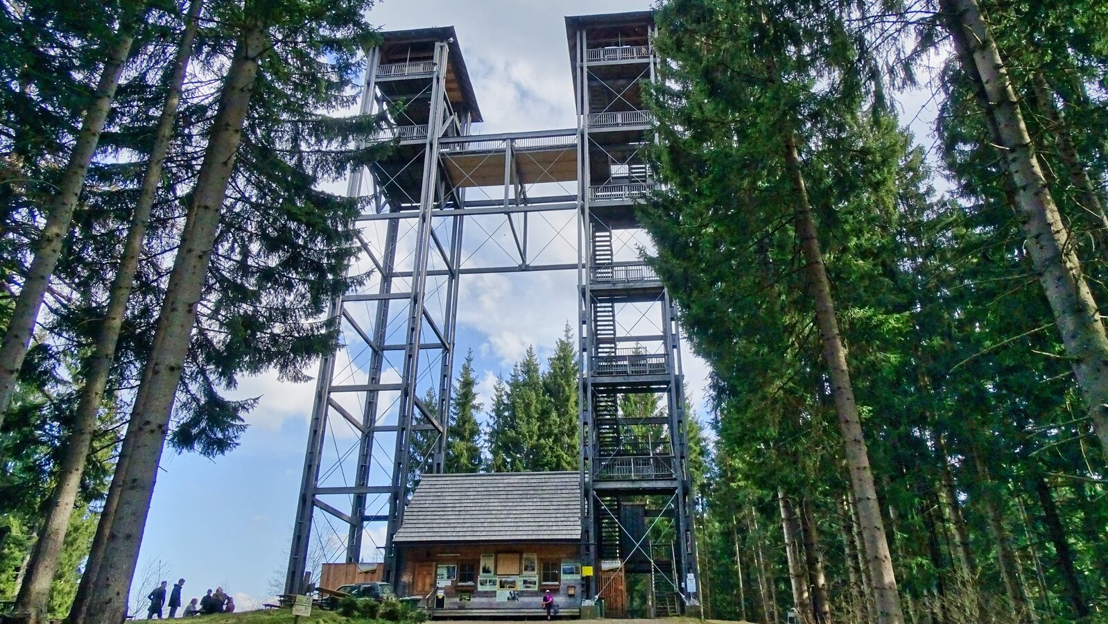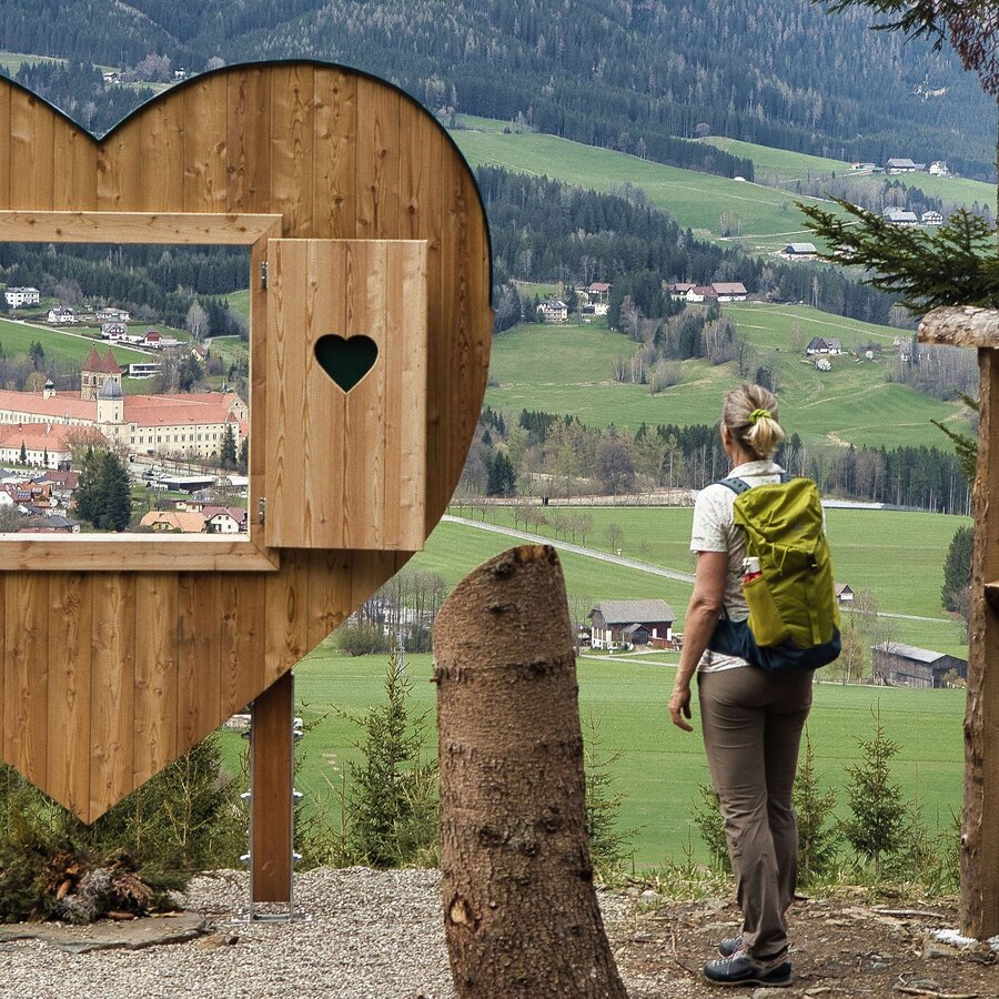 We start at the train station or the main square in Knittelfeld and walk along Frauengasse to Kapuzinerplatz. After a short distance, we reach Brunnerkreuz-Allee, where we walk over the highway overpass to Braunikapelle. The path now leads us into a wooded area, where we follow a wide forest road to the turn-off to the Calvary Church. The marked hiking trail leads through a beautiful landscape and crosses several forest roads. Finally, we reach the impressive “Turm im Gebirge” lookout tower (1194 m), which offers us a fantastic view of the surrounding area. From there, the trail leads slightly downhill to the Calvary Church. The descent leads through the forest and past information boards and Stations of the Cross. At the end of the trail, we reach the populated area of Seckau, where we reach the monastery and the bus station.