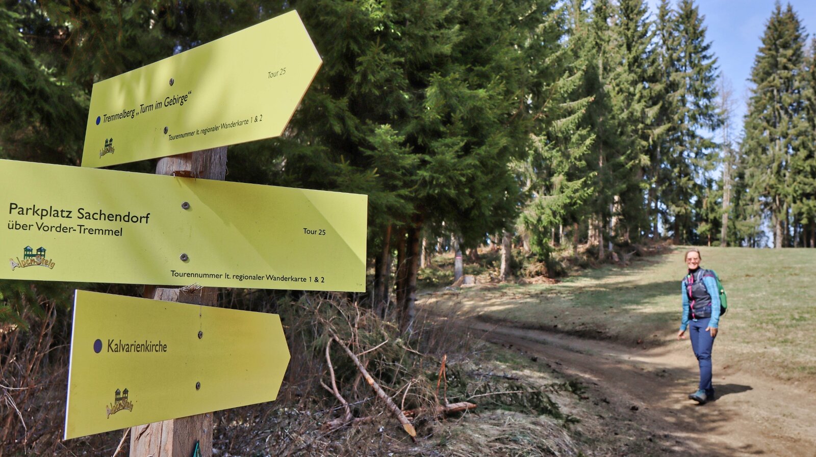 We start from the train station or from the main square, 646 m, in Knittelfeld, which is only a few minutes' walk away, and walk along Frauengasse to Kapuzinerplatz. At the crossroads, turn right - a few meters along Kärntner Straße - and then immediately turn left into Anton-Regner-Straße. Passing the district administration building, we come to a crossroads where we continue to the right. From now on you will see the yellow signposts “Tremmelberg - Seckau - Gaal” with trail number 02. After a few minutes, we come to the start of Brunnerkreuz-Allee. We follow the lime and sycamore avenue slightly uphill, cross the highway overpass and reach the Braunikapelle chapel, 688 m. We continue straight ahead along the road until we reach a forest road junction at the edge of the forest. From now on, the hiking trail leads through wooded areas. A short stretch along the path and we reach a wide forest road, which we now follow for approx. 1 km. We follow the Calvary Church signpost and turn left. The marked hiking trail leads along a path, crosses a forest road and ends on the access road to the farm vlg. Böcksteiner farm, 810 m. We walk past the farm in the immediate vicinity, continuing on the forest road until the hiking trail branches off to the right in a left-hand bend. The junction is easy to recognize thanks to a large stone almond. From now on, we walk more or less along a ridge - always uphill - until we come to a wide forest road. We keep to the right and immediately see the start of the path. As there are now several paths, orientation is not clear due to the lack of markings. We turn right along the ridge and see the red-white-red markings again. We reach a forest road again via hollow paths. From here, we already have a beautiful view of our destination, the “Turm im Gebirge” observation tower. We now hike comfortably uphill, always following the forest road, until we have reached the height and now have only a few meters to the left to the lookout tower on the Tremmelberg (4), 1194 m, in front of us. From the impressive “Turm im Gebirge” lookout tower, we follow the forest road slightly downhill towards the Calvary Church. After a short stretch on the forest road, we reach the Calvary Church. We walk along the well-marked path, which leads past several information boards. The path is initially flat, but gradually becomes steeper. On our way down, we follow the steep hollow path downhill as we cross several forest roads. We always stay on the marked path, which leads us directly downhill until we reach a forest road junction with information boards and stations of the cross. At the forest road junction, we turn left and follow the path downhill through the forest. After a while, the terrain opens up and we walk along meadows. Finally, we reach a small parking lot near a wooden hut and cross a stream, from where we follow the gravel road downhill. We pass some houses and follow an asphalt road until we reach a crossroads. Keep left here and continue straight ahead. At the distinctive crossroads with the dyer's cross, we turn right. The path leads us through the populated area of Seckau. We walk past meadows and residential buildings until we reach the center of Seckau. We continue past the monastery and the municipal office to the bus station, where our hike ends.