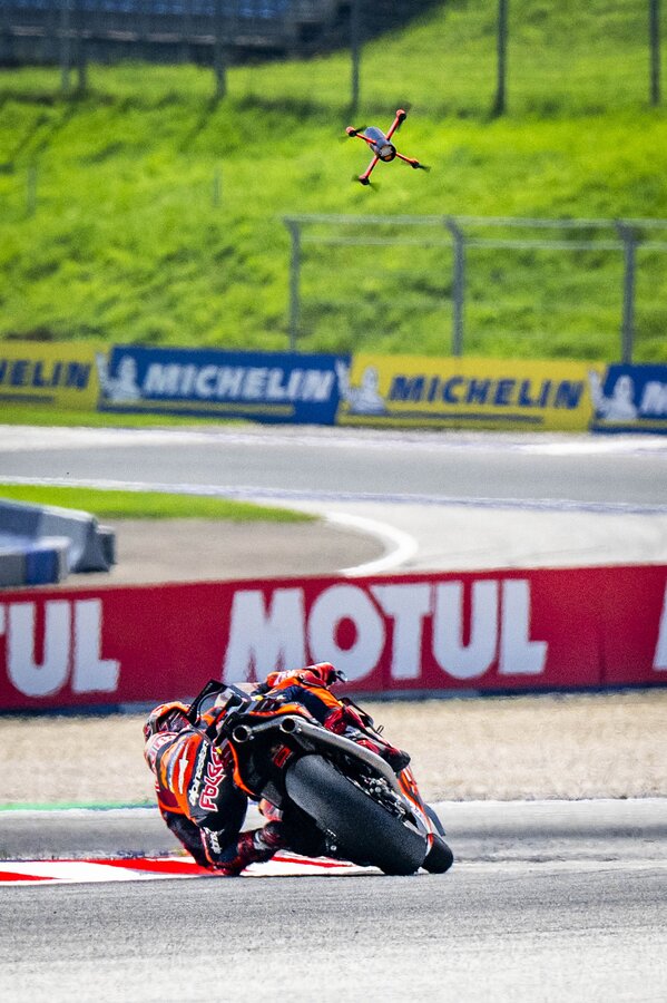 After successfully capturing Max Verstappen in his F1 car in 2024, and being used in the World Rally Championship and the Red Bull Rookies Cup this year, the Red Bull Drone 1 recently made its MotoGP debut at Spielberg. The specially designed FPV drone is controlled entirely manually by Ralph Hogenbirk, alias Shaggy FPV, using two highly sensitive control levers. The pilot adjusts the camera angle simultaneously with his foot. "It was super challenging to follow the MotoGP bike. We can definitely be satisfied with the result. The acceleration is crazy, which, together with the braking phases, are the two fundamental differences to a Formula 1 car. Jonas really put his foot down, and we have to catch that point when he revs up, otherwise he'll pull away from us. The Red Bull Ring is very demanding for flying. We had to use all kinds of braking maneuvers and camera angles throughout the entire lap. The combination of tight and fast corners and high-speed straights is really fun," said Hogenbirk enthusiastically after following Jonas Folger on a premier class motorcycle at high speed and capturing spectacular images.