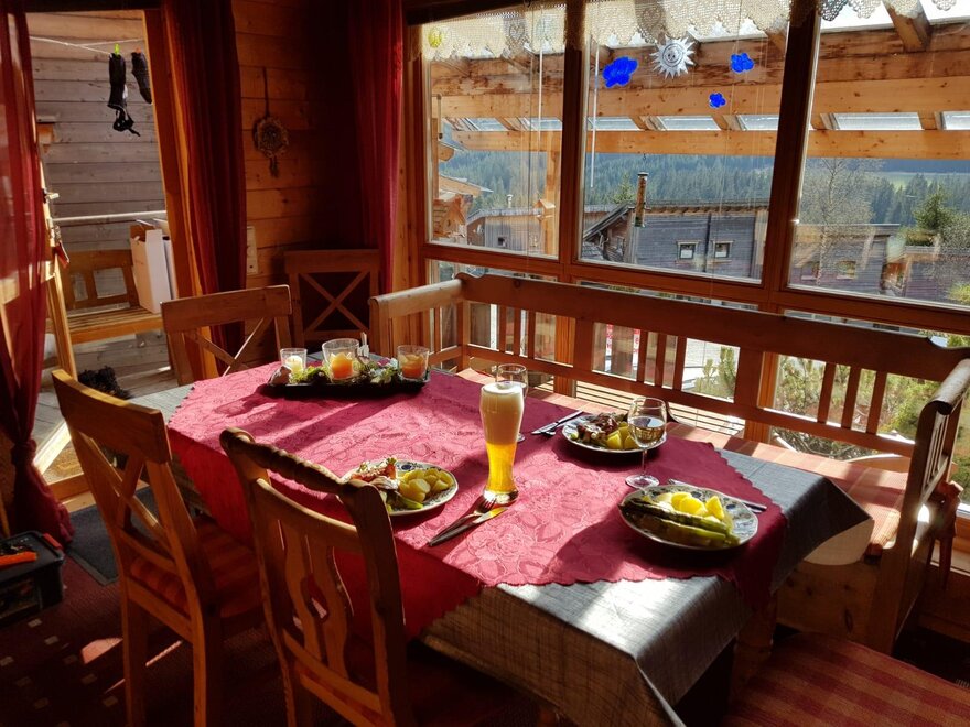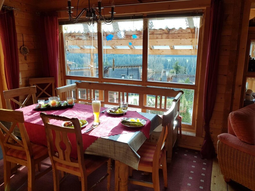 The dining room offers you a unique panoramic view of the "Großer Hengst". Connected to the living room, both form a spacious unit and a wood-burning stove provides a cosy atmosphere. After an enchanting day, you can end the day in the conservatory with a glass of wine and watch the mountain scenery opposite at sunset or gaze at the romantic starry sky at a late hour.