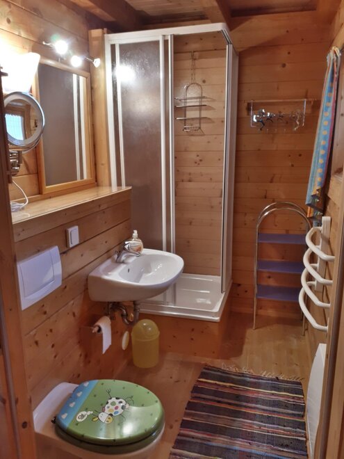 One bathroom with bathtub and WC on the ground floor and a shower room with WC on the upper floor shorten the waiting time in the morning.
