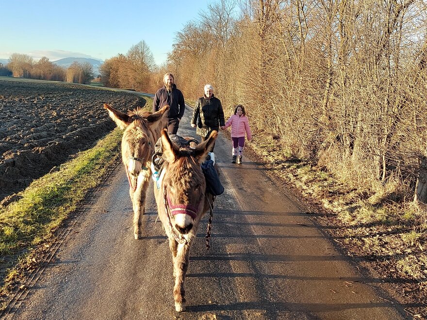 Our sensitive donkey mare adapts to her counterpart by herself and can therefore also be led by children, senior citizens or people with disabilities.