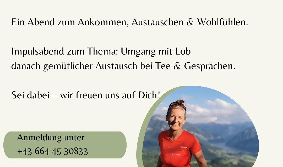 Together with the wonderful Doris Jax - Certified Neuromental Trainer, we will delve into the topic: "Dealing with Praise" - an evening of impulses that touches and moves.