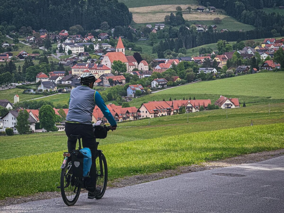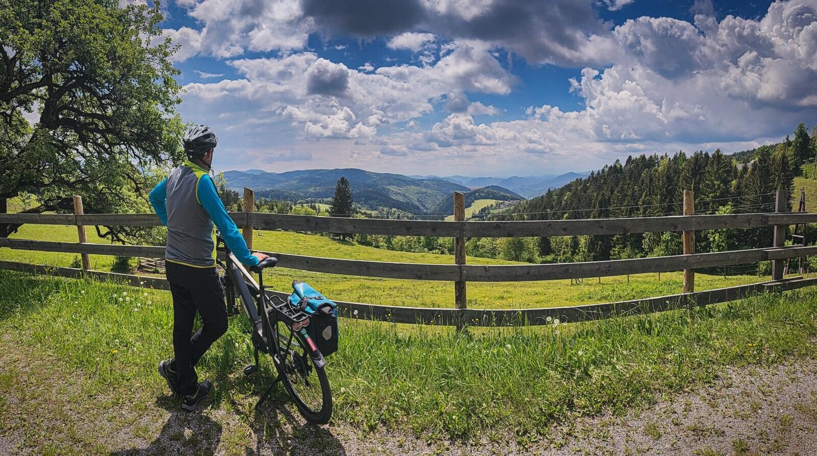Peggau is an ideal starting point for this tour – easily accessible via the Murradweg or by S-Bahn, which also allows bicycle transport. The route begins on the eastern (left) bank of the Mur River, heading south. After turning off onto the quiet Hieningstraße, the path winds through the forest and up a series of switchbacks, climbing around 400 meters in elevation to reach a lush high plateau. Once at the top, you’ll be rewarded with panoramic views of the Schöckl and the Graz mountain region.