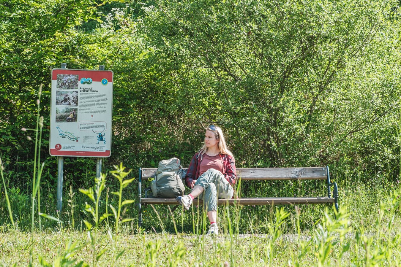 Der idyllische Reiner Barfußweg führt entlang vom Mühlbach und vorbei an mehreren Mitmach-Stationen. Der barrierefreie Weg ist auch für Kinderwägen gut geeignet.