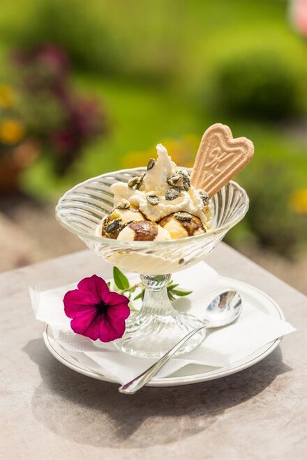 Welcome to Alpengasthaus Edelbrunn! We invite you to stay at our family-run inn at the climatic-health area Ramsau am Dachstein. Located 1,333 meters above sea level, the sunny and peaceful Edelbrunn appeals not only to hikers that want to explore the surrounding area but to everyone who enjoys a comfortable atmosphere and a breathtaking view across the Schladminger Tauern. Get drawn in by the warm Styrian hospitality! Enjoy a cup of coffee, our homemade pastries or a delightful meal on the sun-bathed terrace that overlooks stunning Low Tauern and Ramsau's magnificent high plateau. Our kitchen staff prepares a great variety of traditional and regional specialities that appeal to everyone. You can spend a pleasant evening at our cozy À-la-carte-Restaurant enjoying a glass of refined Austrian quality wine with your meal. The comfortable single, double or triple rooms have everything needed for a restorative holiday. All rooms include a private restroom with a shower, satellite TV, a safe and a balcony – one room with a sunroom - from which you can appreciate the surrounding landscape of Ramsau am Dachstein. Additionally, we offer free wi-fi access. Enjoy our nourishing breakfast that will strengthen you for the day's excursions in the Schladming-Dachstein region. The Alpengasthaus Edelbrunn is an excellent starting point for hiking the high plateau Ramsau am Dachstein. Popular routes include the 5 Huetten Weg, the Roseggersteig, and the Jungfrauensteig, all of which start at Alpengasthaus Edelbrunn. From here you can explore the Ramsauer Alpine region and the fascinating mountain range below the Dachstein massif. There are hiking opportunities surrounding the Edelbrunn for everyone – experienced mountain hiker as well as families. The Rittisberg, located a short distance away from Edelbrunn, appeals especially to children. Not only can they take a ride on the Alpine Coaster, they can also jump into the lake Ramsau Beach on a hot summer day. If the weather does not play along, our guests at Alpengasthaus Edelbrunn can make use of their free entrance to the pools and saunas of Ramsau am Dachstein. In winter you can look forward to snowy fields glittering in bright sunshine. Hearing the crunchy snow below your feet while taking a romantic walk is a must-do for your vacation at Ramsau am Dachstein. The Alpengasthaus Edelbrunn is the ideal place to start a hike in wintertime – either in snow boots, on foot or taking cross country skis. Even though you are surrounded by untouched winter landscape at Edelbrunn, you are only a few minutes away from Rittisberg's Winter World and ski slopes. Additionally, the 220 kilometer long, well-prepared skiing trails of Ramsau am Dachstein are only a short distance away. Only 15 minutes walk from the Edelbrunn is a bus that can take you to great skiing and hiking locations such as the Dachsteingletscher and the 4-Berge Skischaukel Hauser Kaibling-Planai-Hochwurzen-Reiteralm at the ski region Ski Amadé. Unwind at the holiday region Schladming-Dachstein and spend the best time of the year at the Alpengasthaus Edelbrunn. We are looking forward to welcoming you here, Family Wieser
