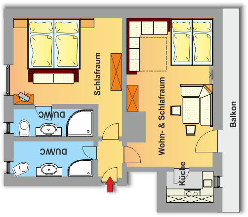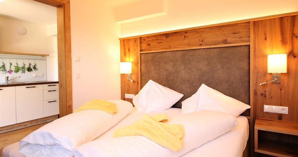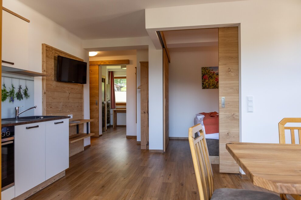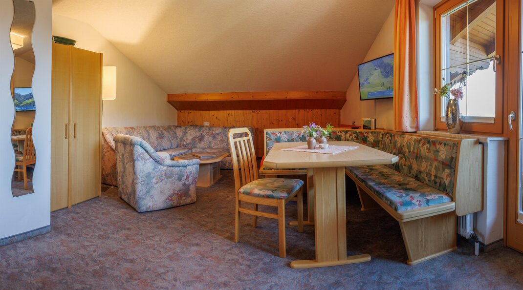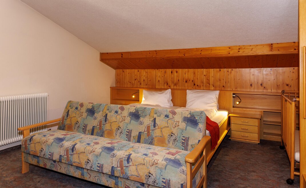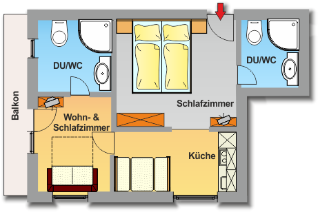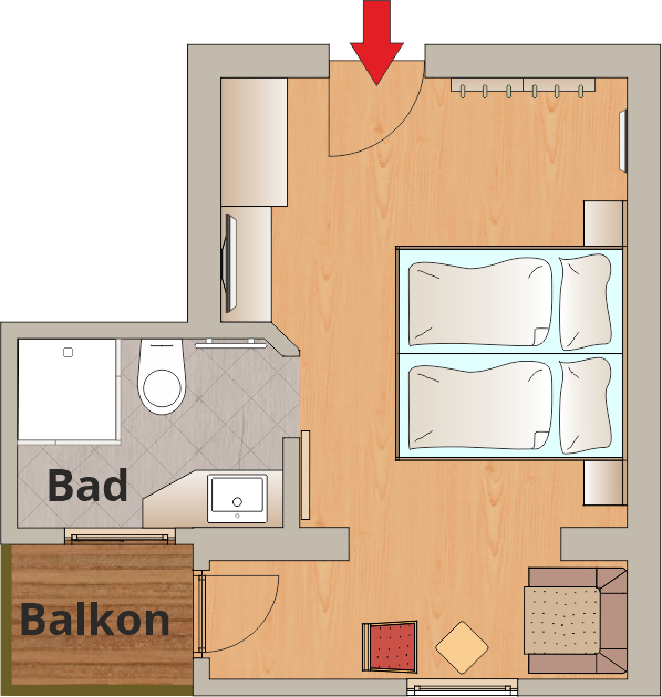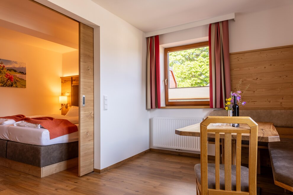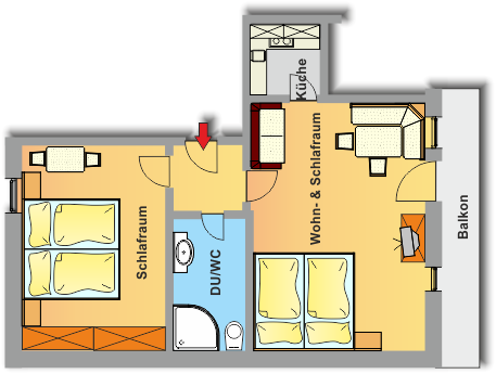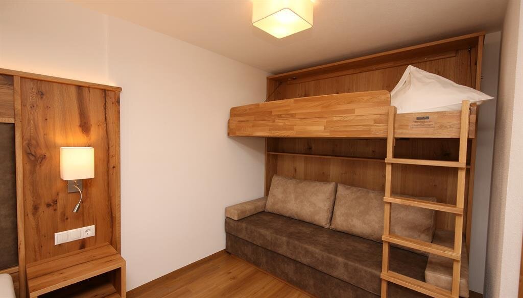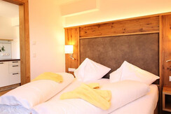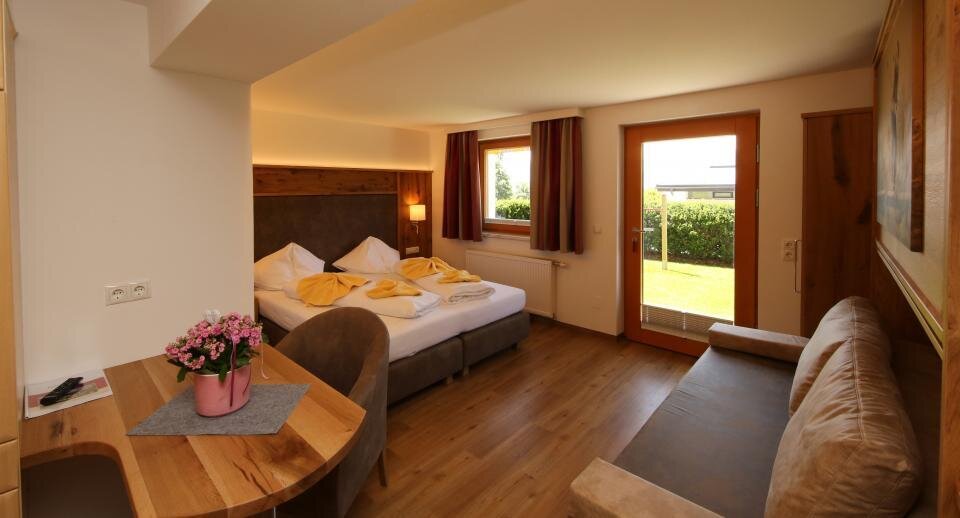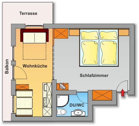 Arrive and feel good. This fully equipped family room or flat consists of a bedroom and a bed-sit room with kitchenette and dining table (separated by sliding doors) and allows comfortable living for 2 - 4 people. A shower/WC unit, as well as a balcony with access to a private terrace complete this family flat.