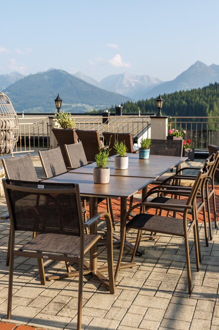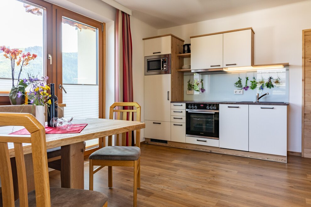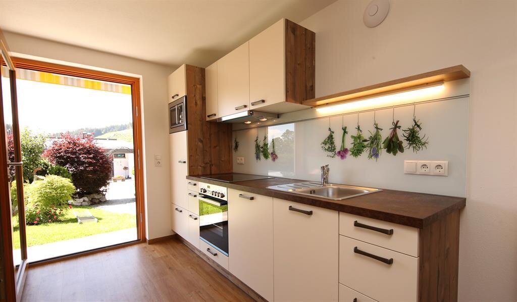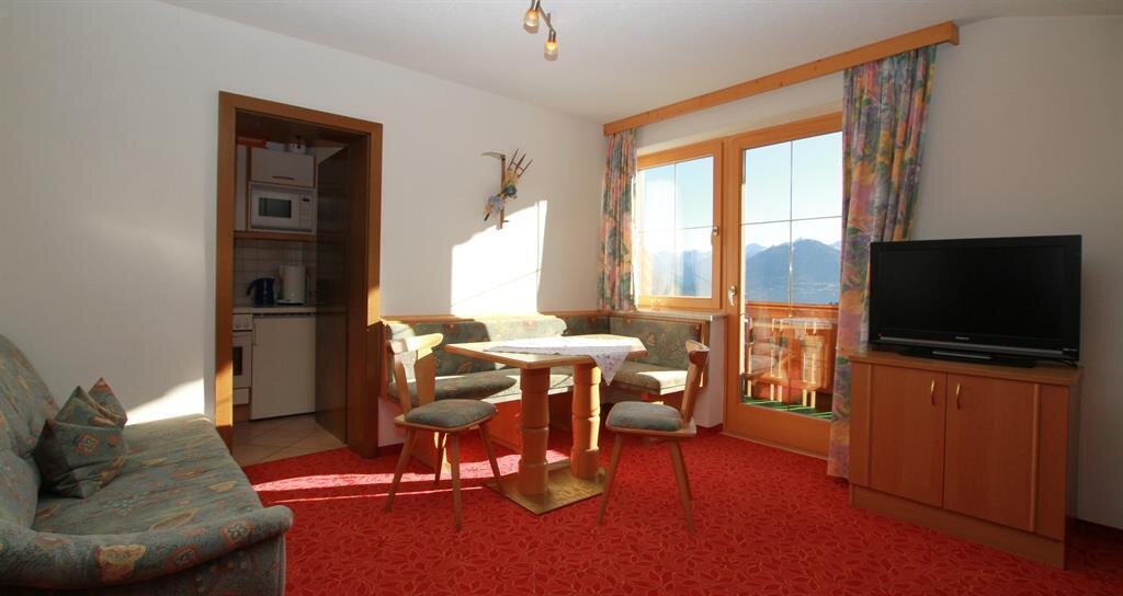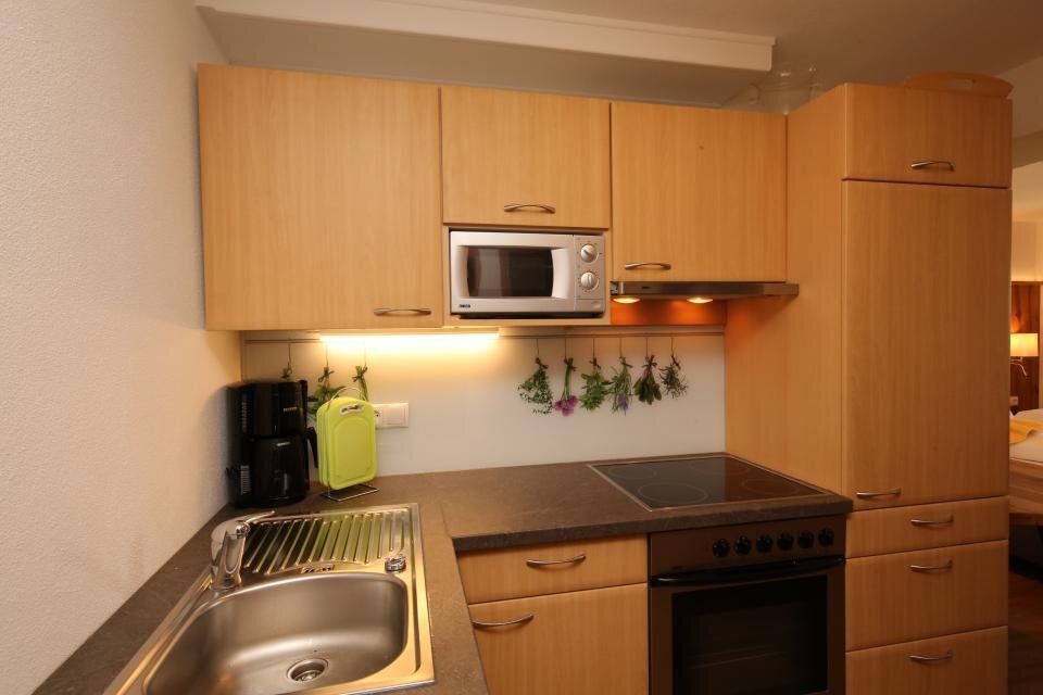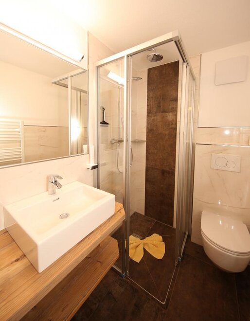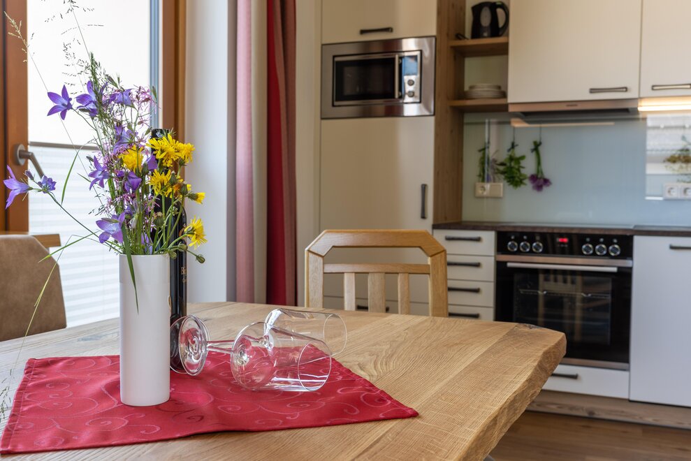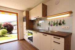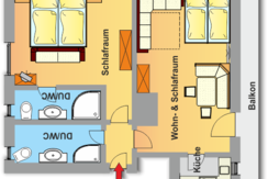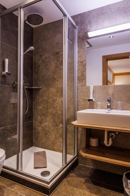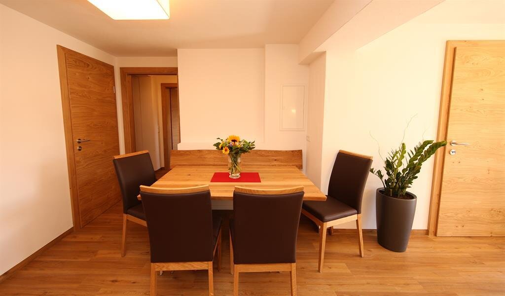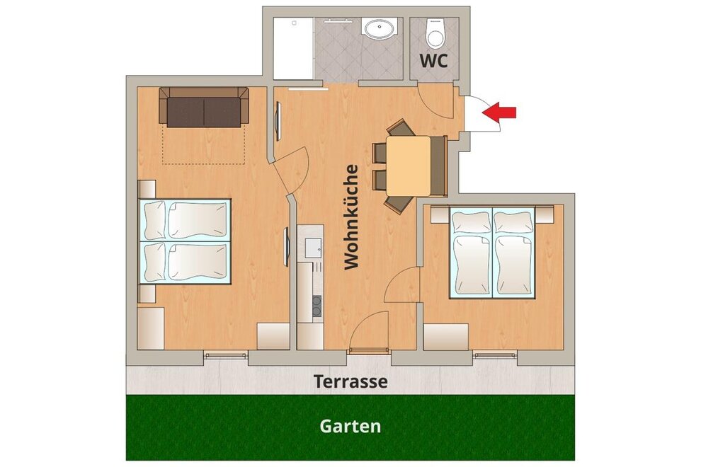 Arrive and feel good. This fully equipped family room or flat consists of a bedroom and a bed-sit room with kitchenette and dining table (separated by sliding doors) and allows comfortable living for 2 - 4 people. A shower/WC unit, as well as a balcony with access to a private terrace complete this family flat.