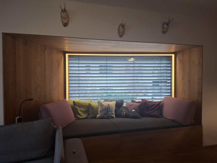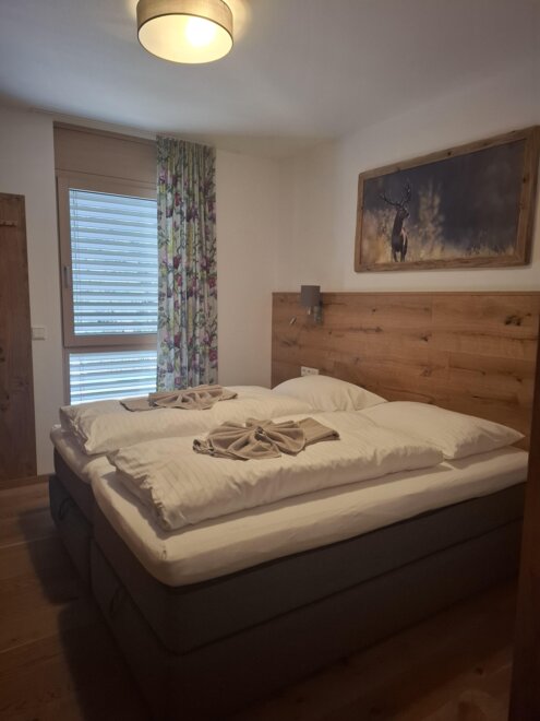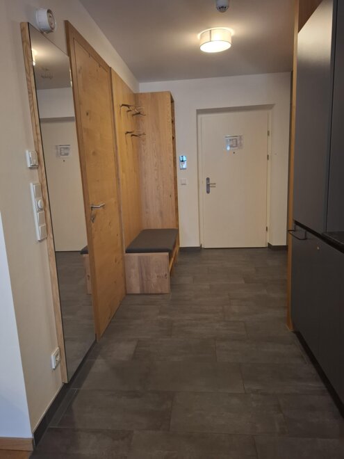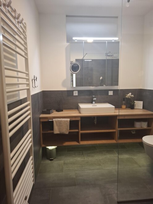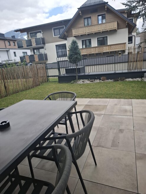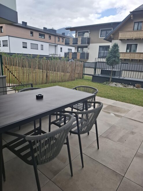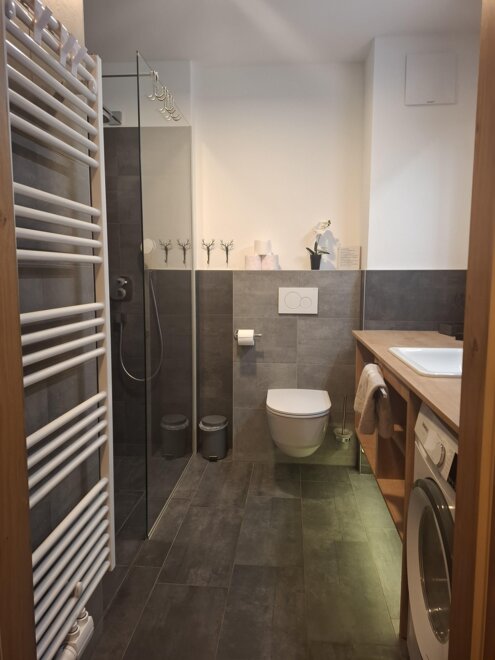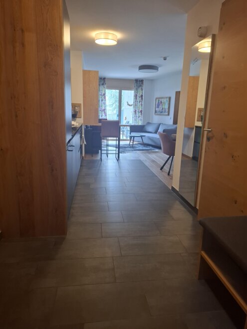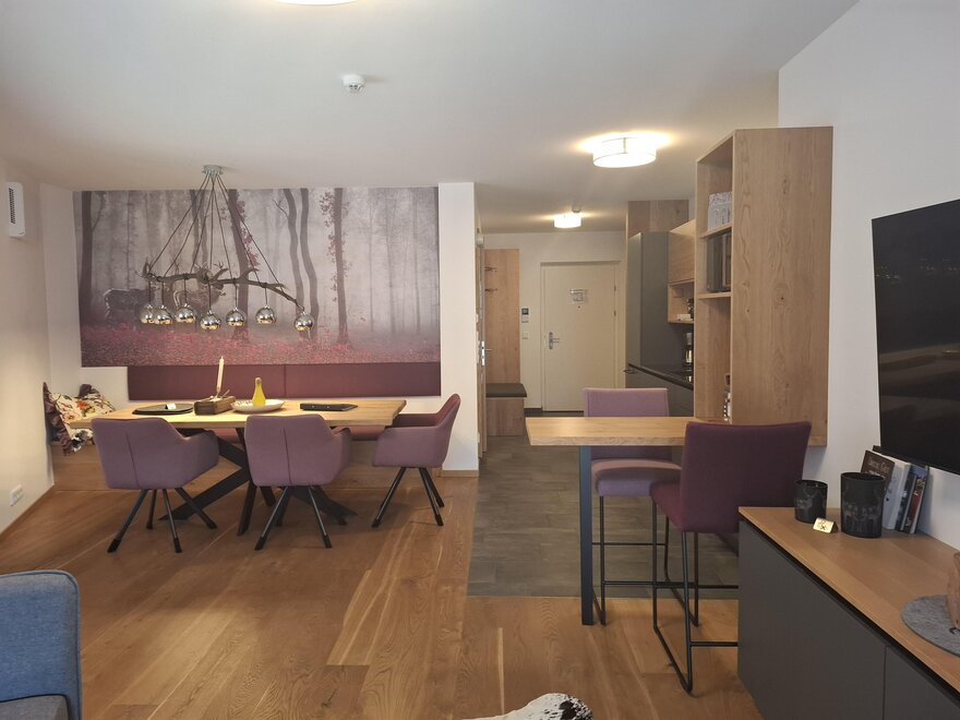 The apartment ALPENKRONE offers 70sqm of living space on the ground floor with a large terrace and small garden. The 30sqm open-plan living area with fully equipped kitchenette such as oven, microwave, coffee machine and accessories, dining room and sitting area is colourfully furnished in modern Alpine style with great attention to detail.