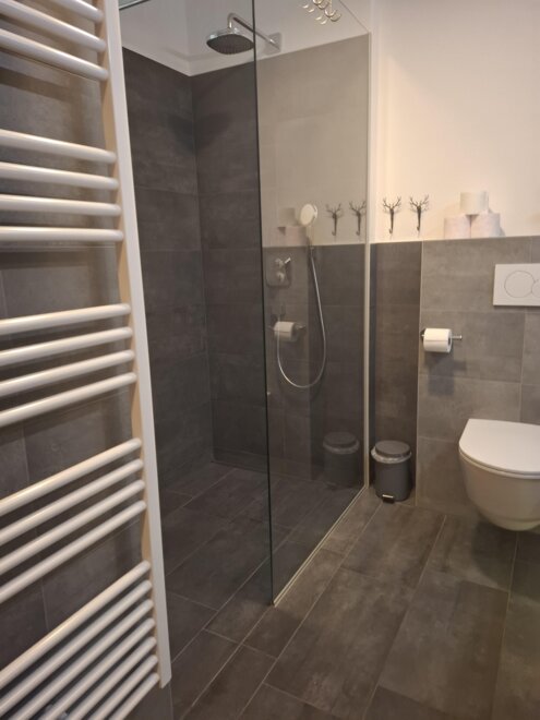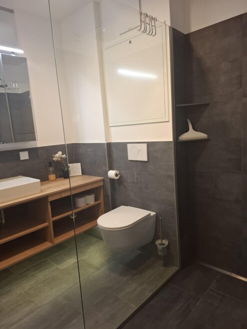 Bedroom 1, accessible only via the small hallway, has its own bathroom, bedroom 2 has "bath en suite". The bedrooms are furnished with double beds, which can be converted into single beds, and each has a Smart TV. The cosy sofa bed in the living area allows 2 more people to sleep comfortably.