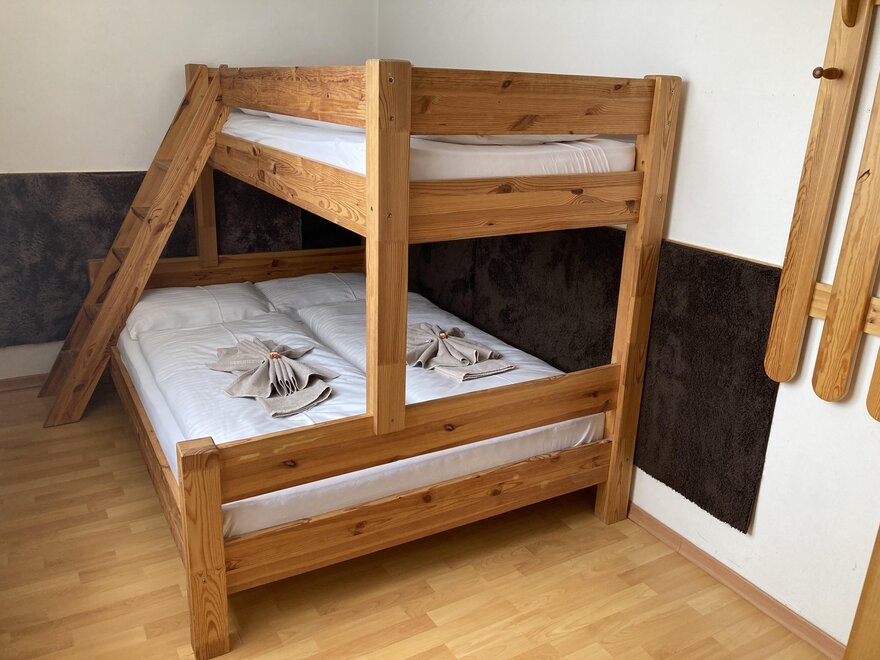 *A bedroom with a double bunk bed, a single bed upstairs and a double bed downstairs.