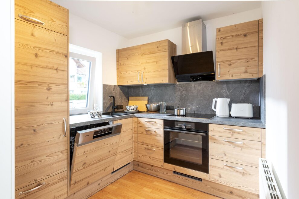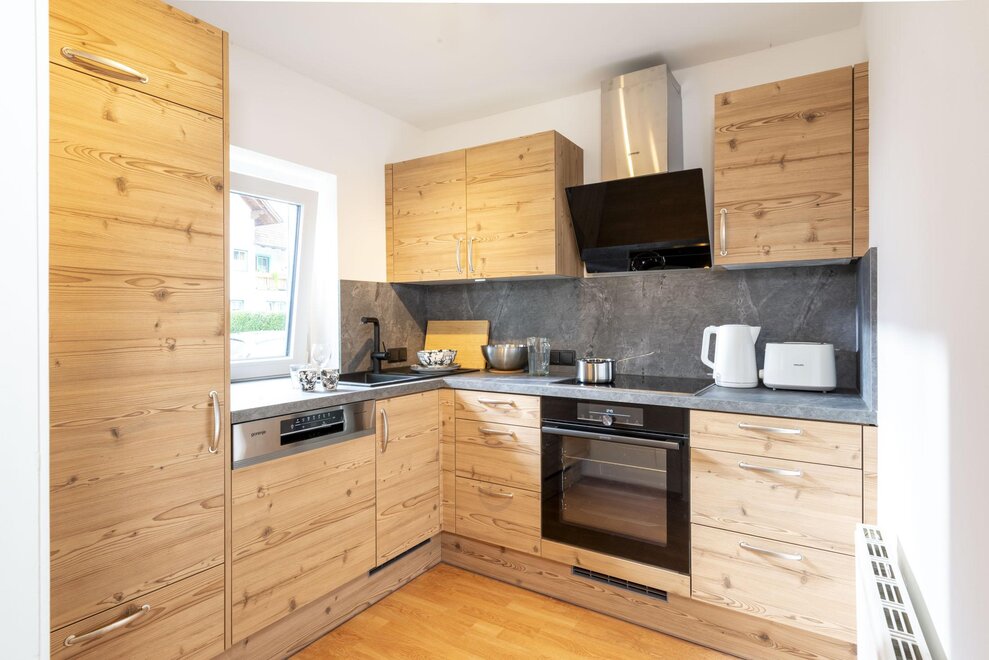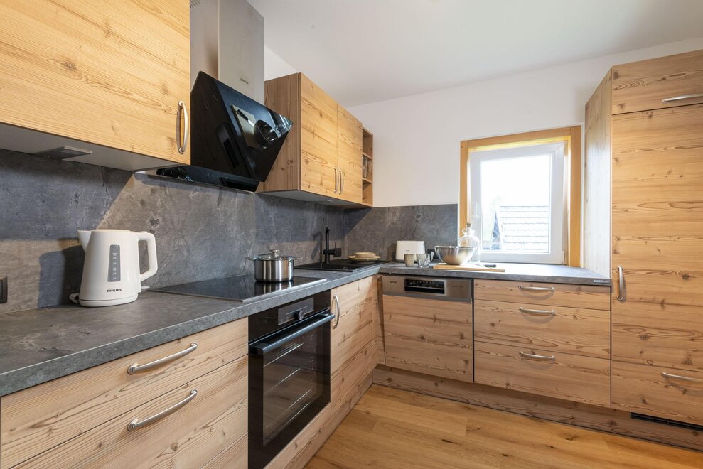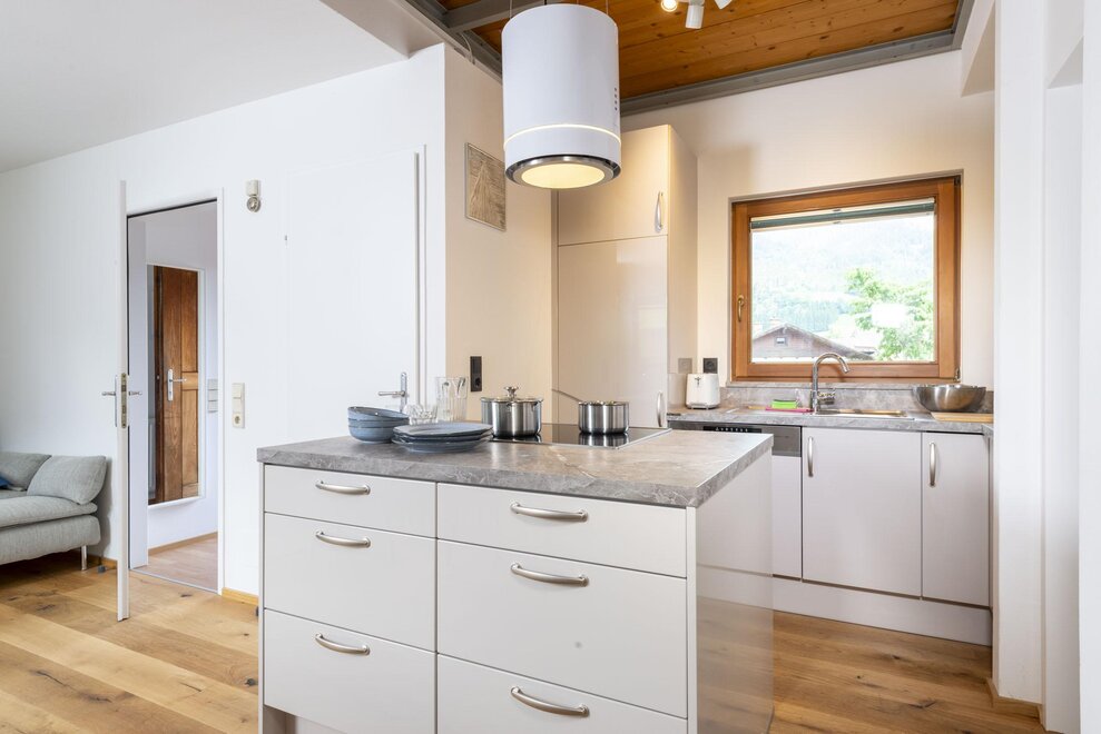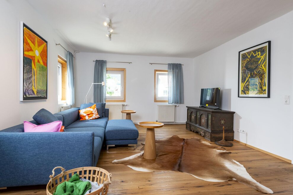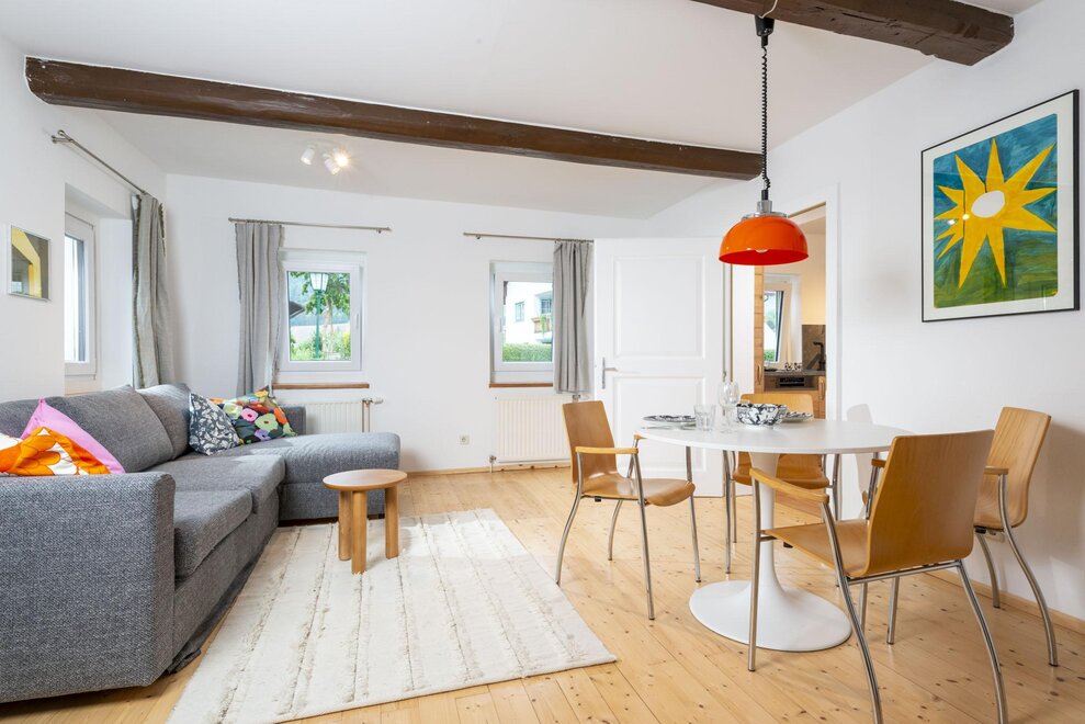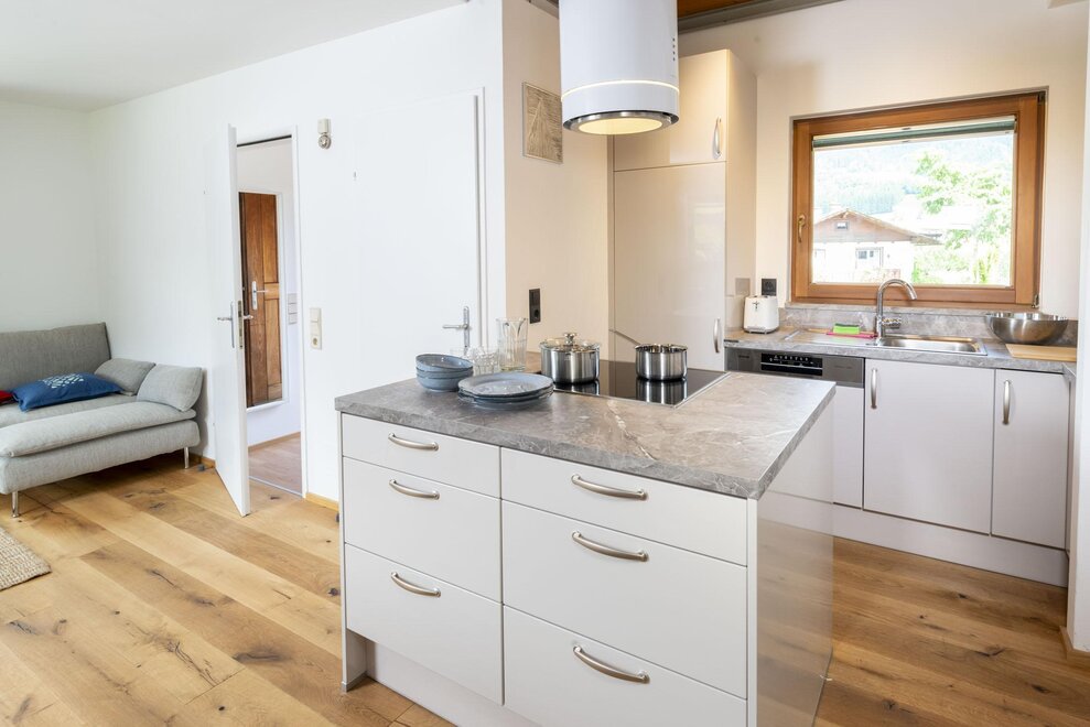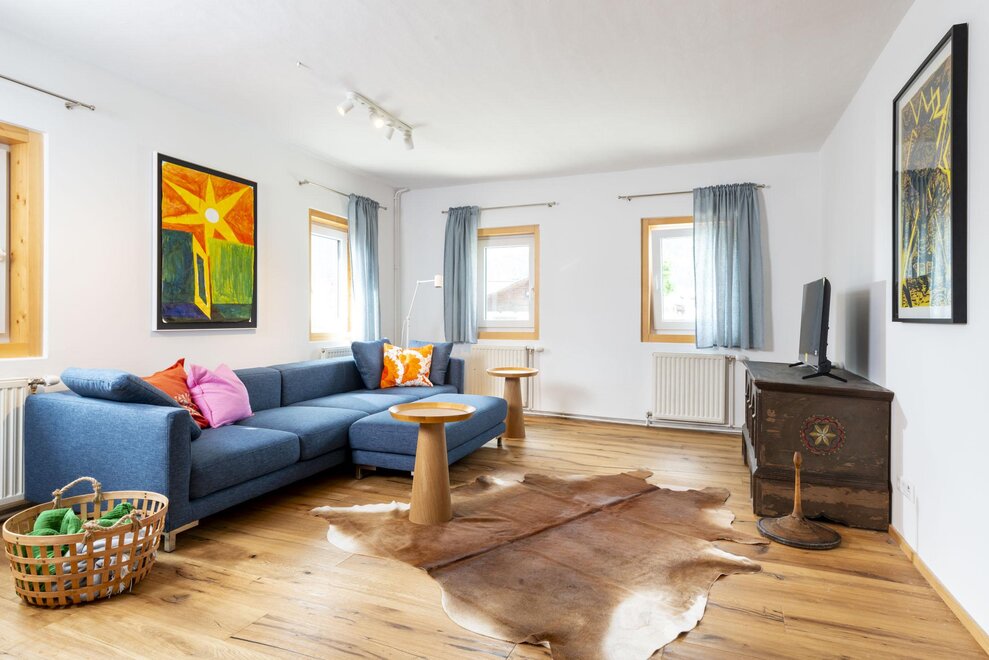 The cozy living room with a comfortable seating area and the well-equipped kitchen invite you to cook and relax together after an active day.