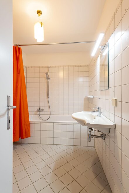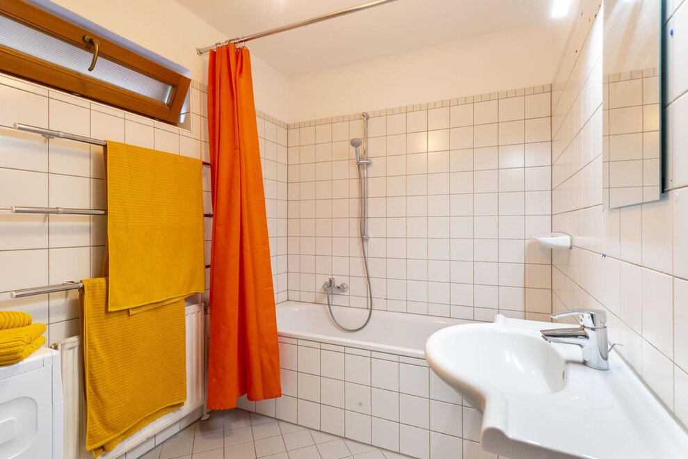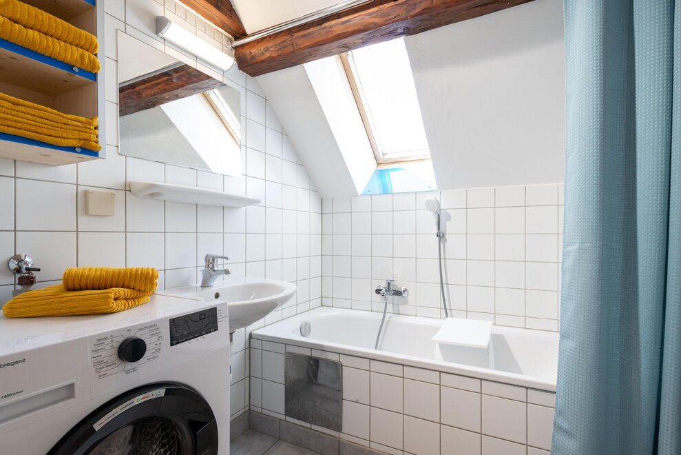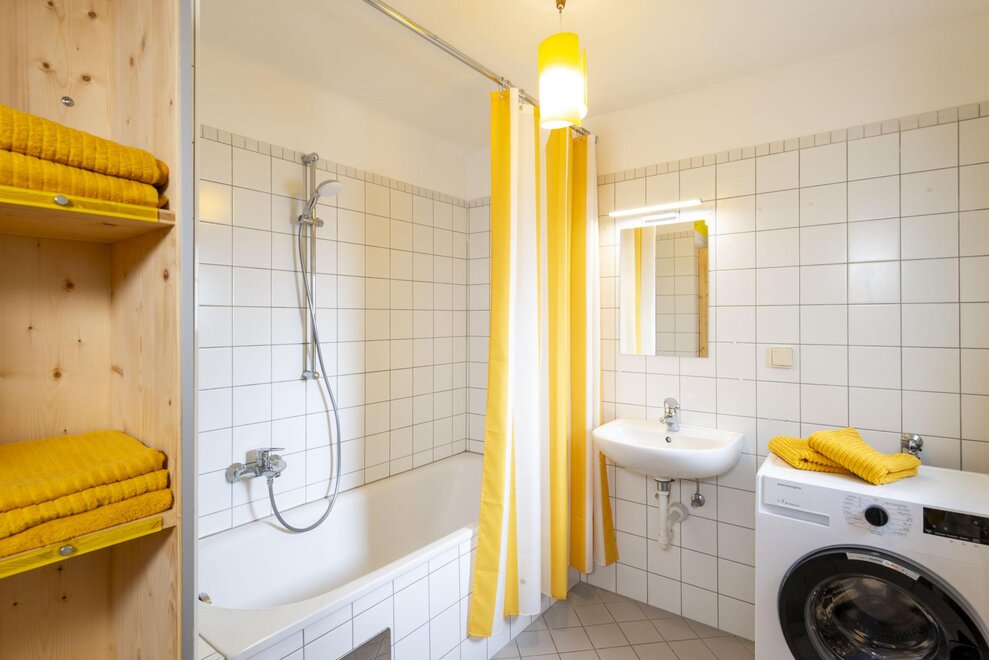 The bathroom is equipped with a bathtub, and a separate toilet adds extra comfort. A washing machine is also available.