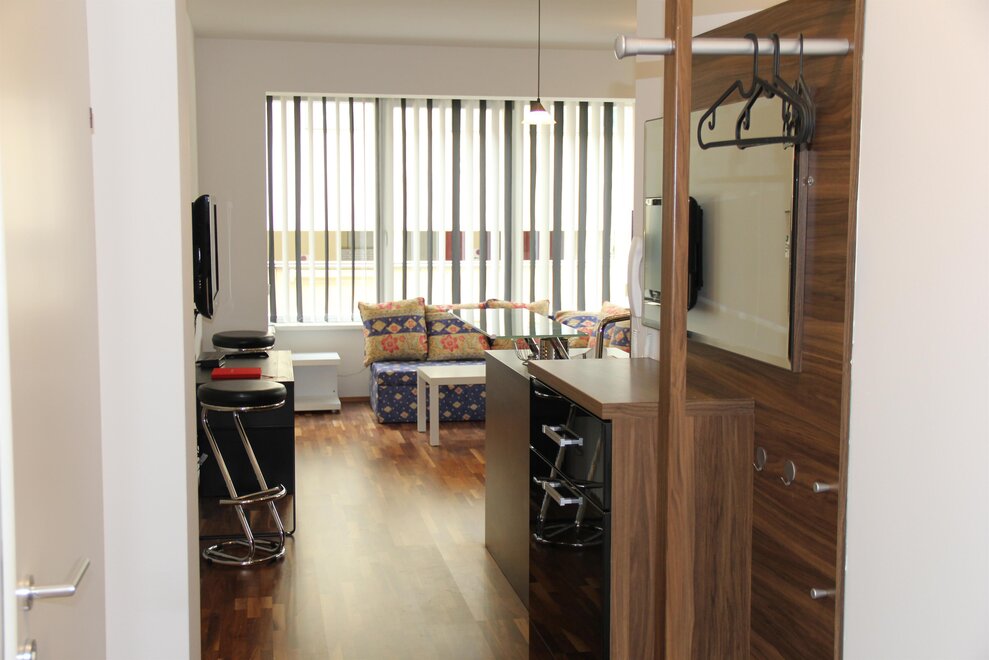 The apartment has a fully equipped kitchen, a spacious dining and living area, a bathroom with double vanity, and a separate toilet.