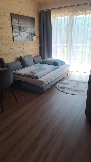 This impresses with its cozy alpine style with lots of wooden elements. The apartment has a kitchen-living room equipped with the most important cooking utensils, a separate bedroom, a spacious bathroom with shower and toilet. Enjoy the view of the Lower Tauern and the Planai from your south-facing balcony.