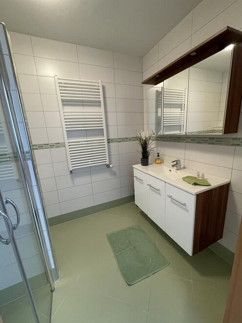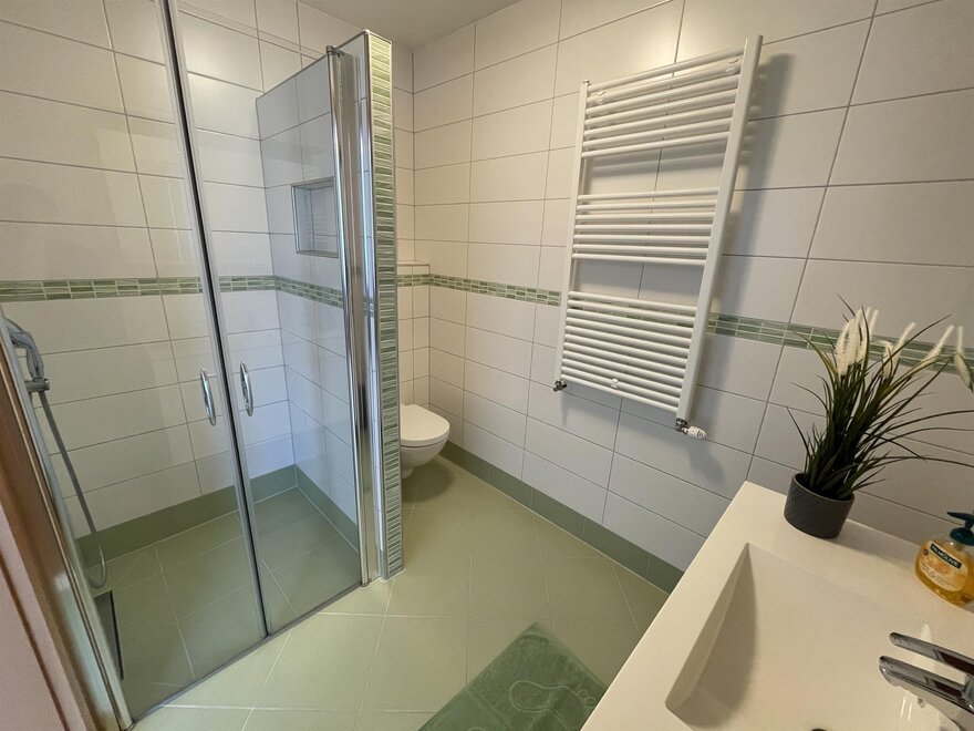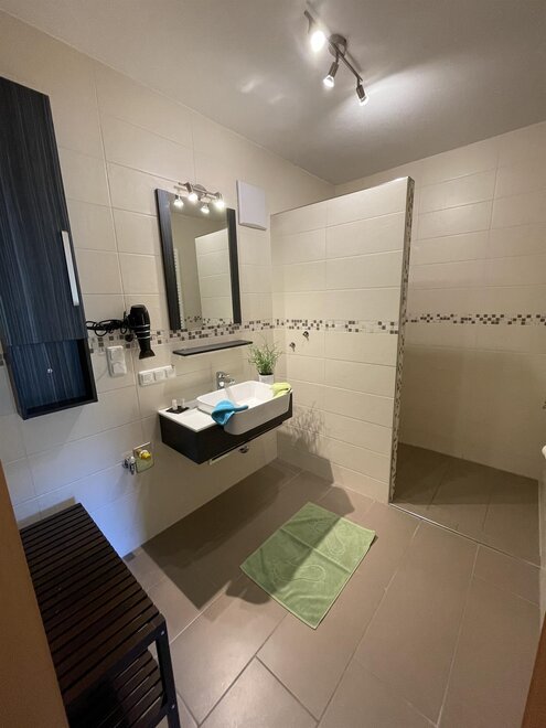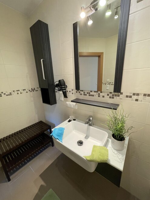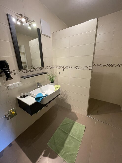 Bathroom with shower, washbasin, hairdryer, and towel warmer