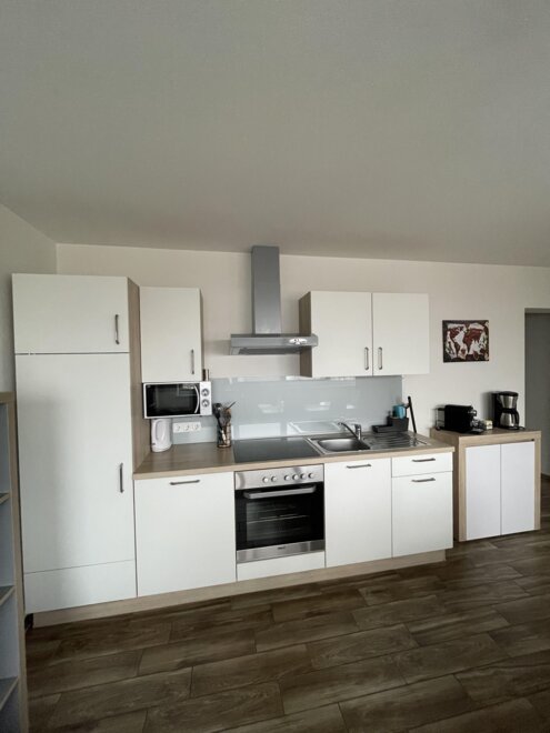 Large living kitchen with dishwasher, electric stove, microwave, fridge and freezer, kettle, filter coffee machine, capsule coffee machine, toaster.