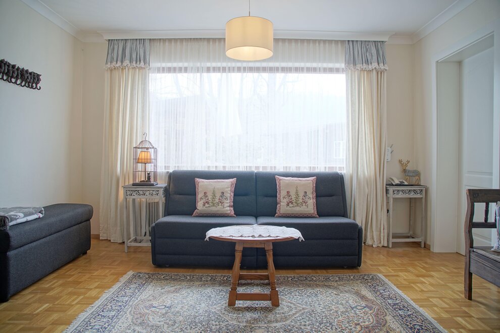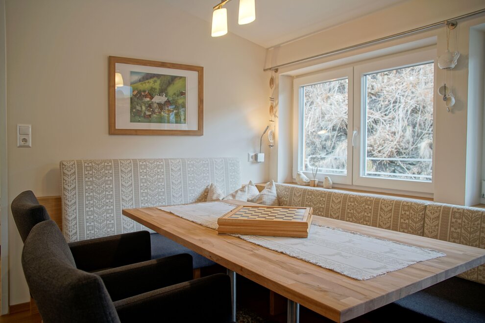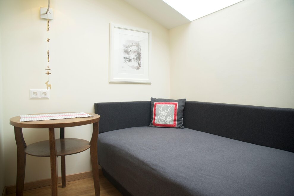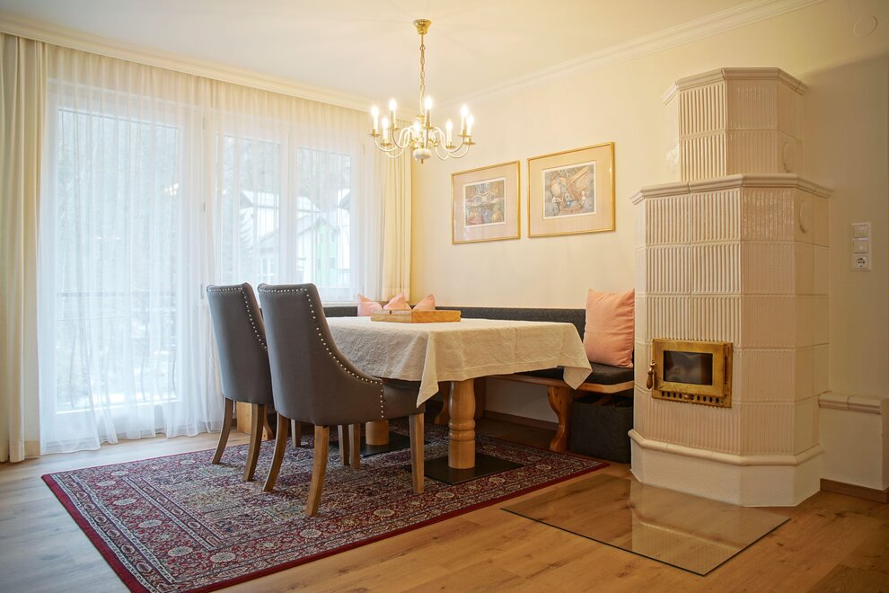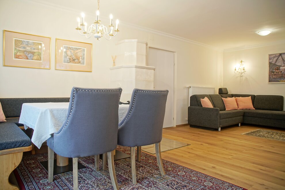 Cozy living and dining room with a sofa bed and tiled stove.