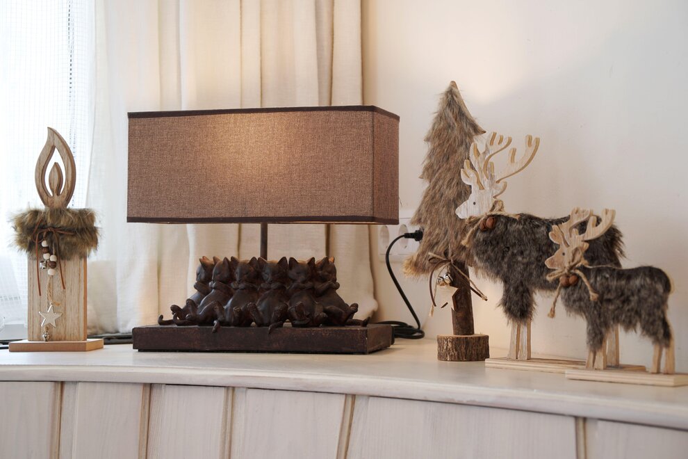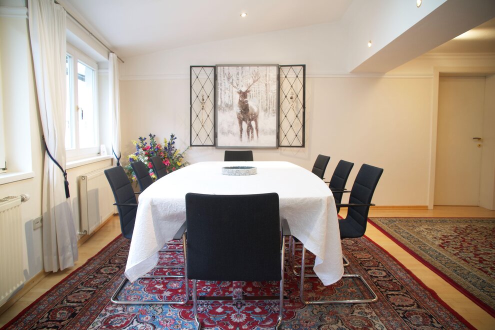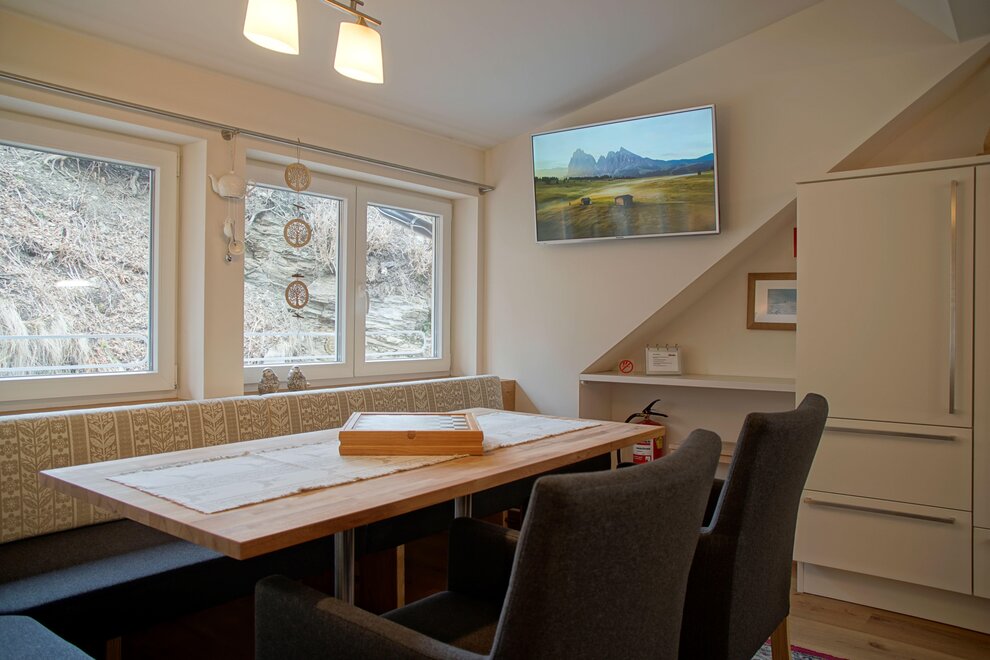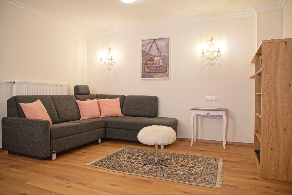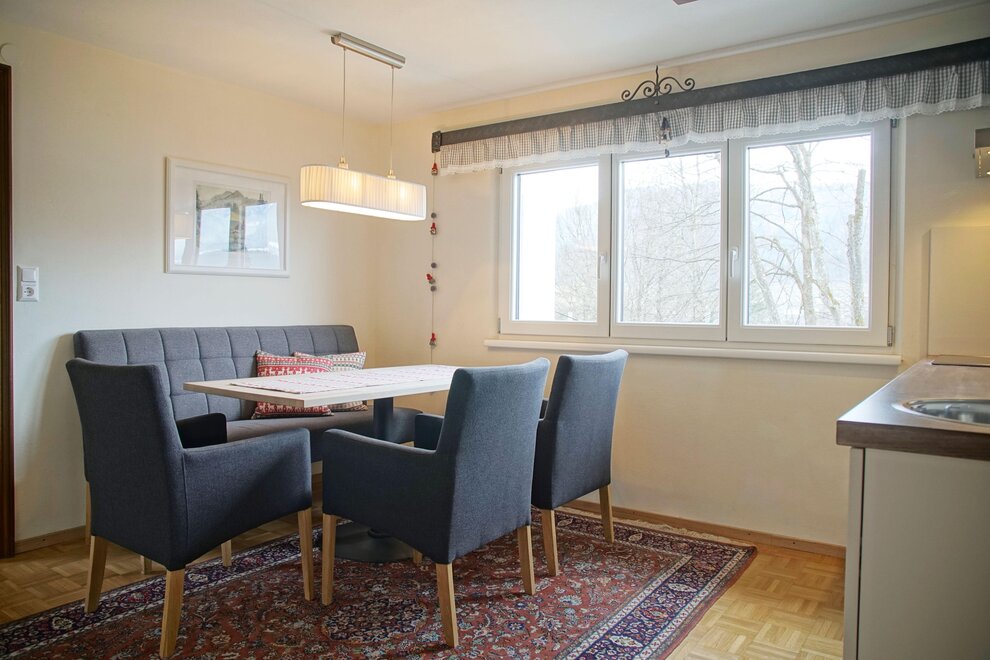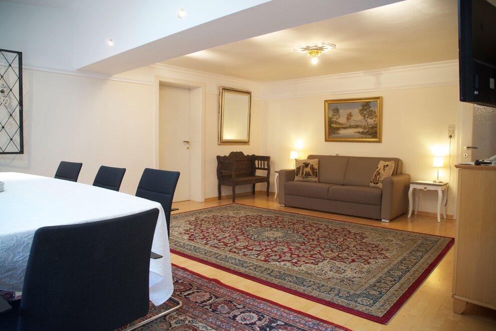 Cozy living and dining room with a sofa bed and tiled stove.