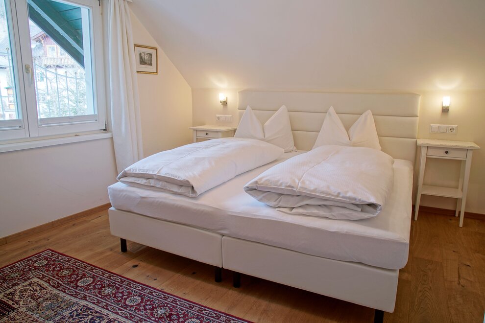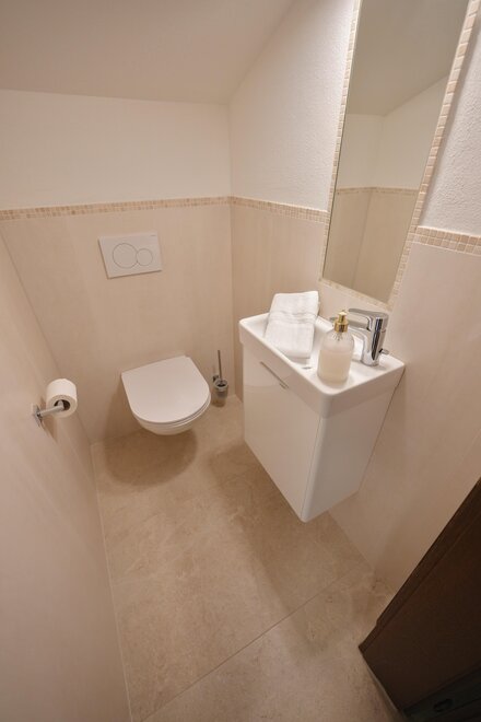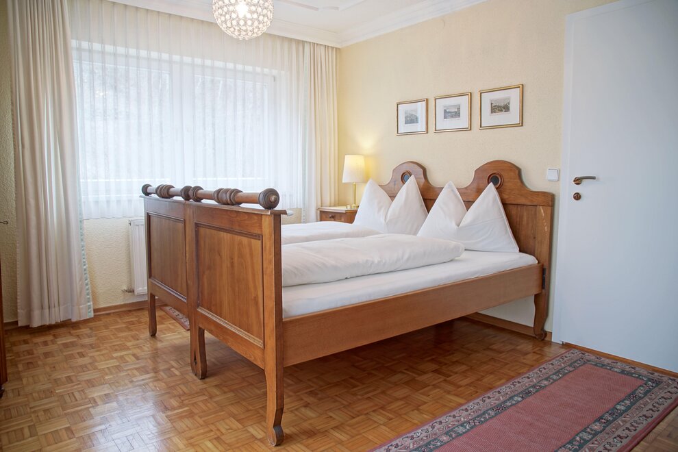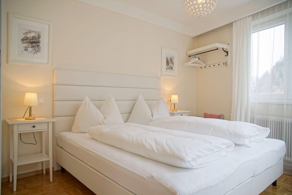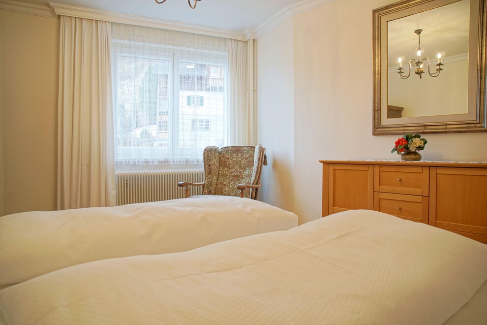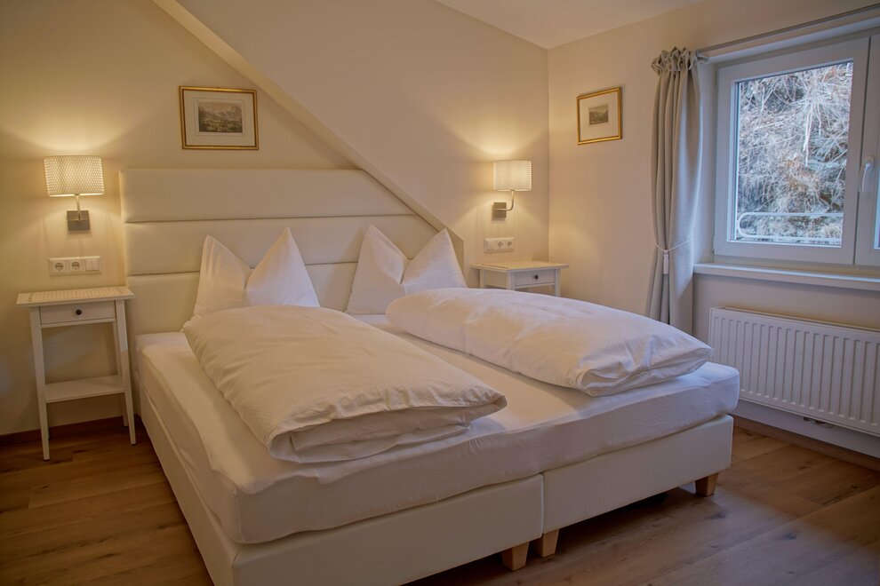 Spacious apartment with two bedrooms featuring box spring beds, a bathroom, and a separate toilet.