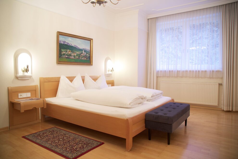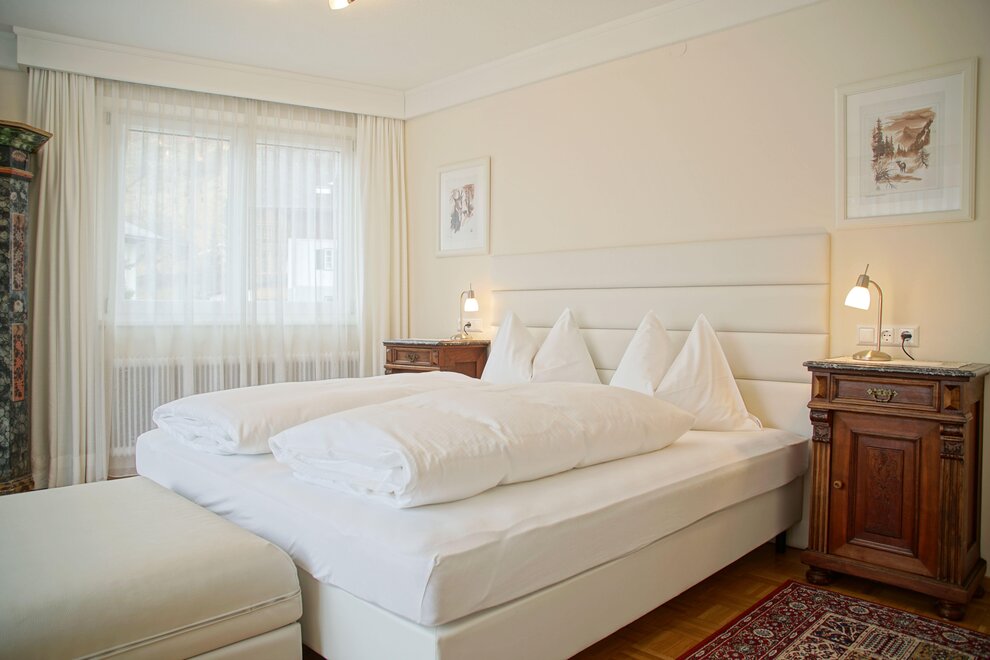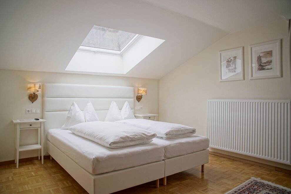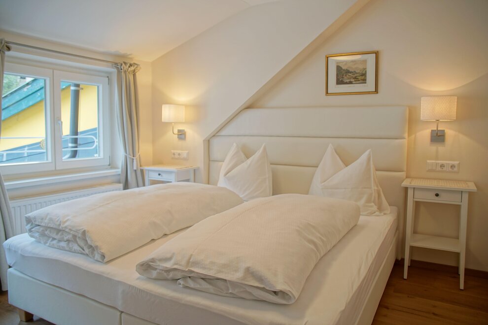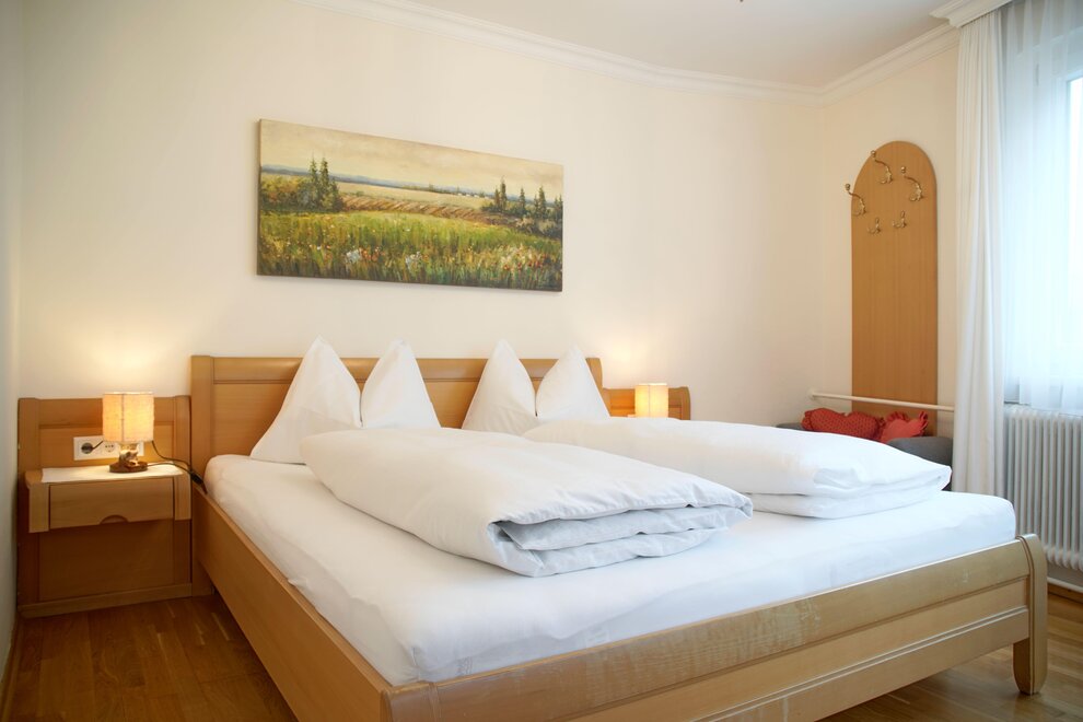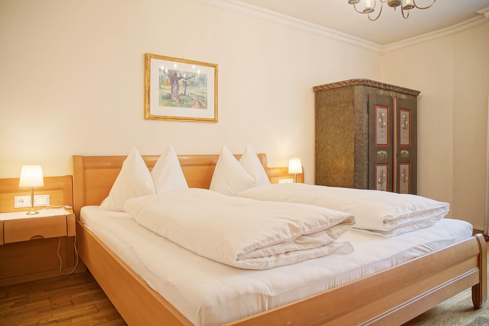 Spacious apartment with two bedrooms featuring box spring beds, a bathroom, and a separate toilet.
