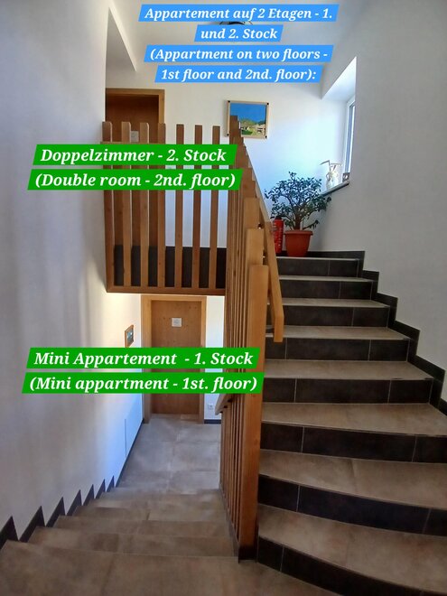 The apartment over 2 floors consists of the mini apartment Kammblick on the 1st floor and the double room on the 2nd floor. The mini apartment Kammblick is a small apartment (approx. 30 m²) with a sleeping area, rustic corner bench (for 4 to 5 people), kitchenette, and a bathroom with toilet and shower.