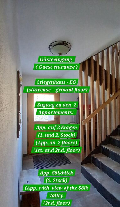 The Sölkblick Apartment offers approximately 68 m² of a friendly ambiance with generous facilities for 4 to a maximum of 6 people: 2 bedrooms with TV, table, and cupboard. Both bedrooms have a double bed (180 x 200 cm), one of which has an additional single bed. A sofa bed for 1 person is available in the hallway;