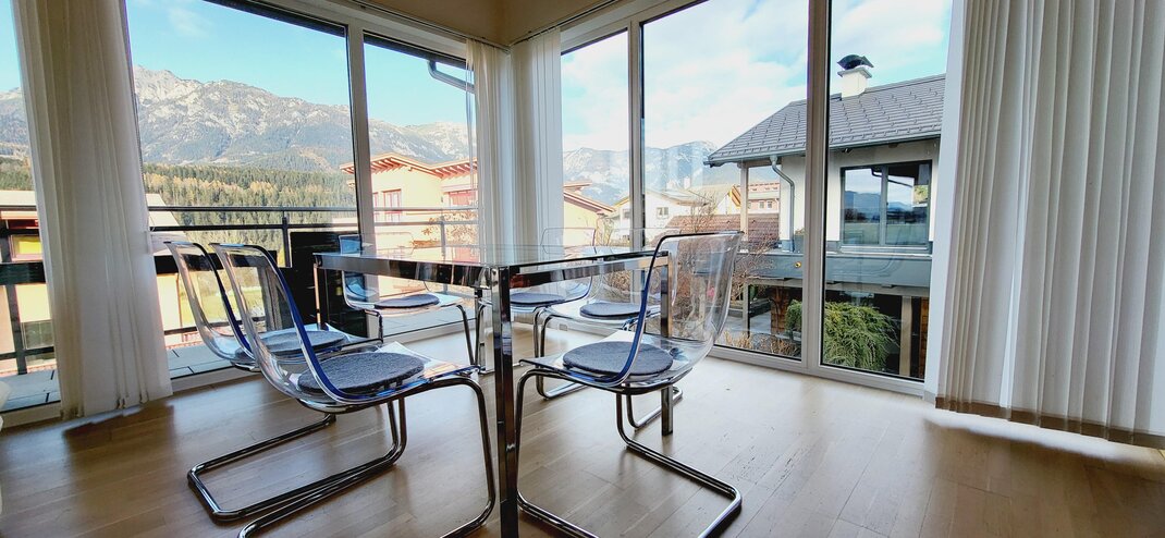 The apartment offers a spacious kitchen, living, and dining area with a breathtaking view of the surrounding mountain landscape. Two bedrooms and a large pull-out couch provide ample space for all guests. A bathroom as well as a separate toilet ensure additional comfort.