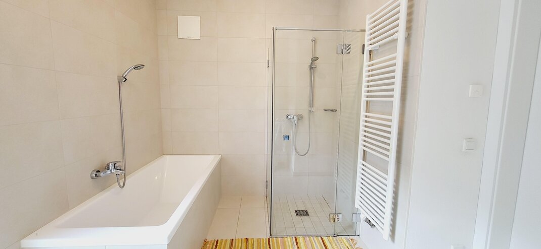 bathtub, running hot/cold water, separate toilet, no. of bathrooms: 1, double sink, no. of toilets: 1, wash stand, toilet, shower, shower or bathtub, bath