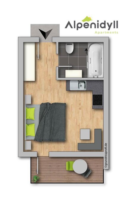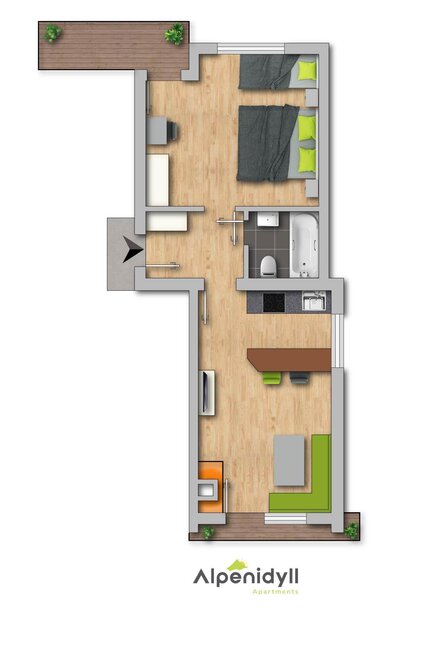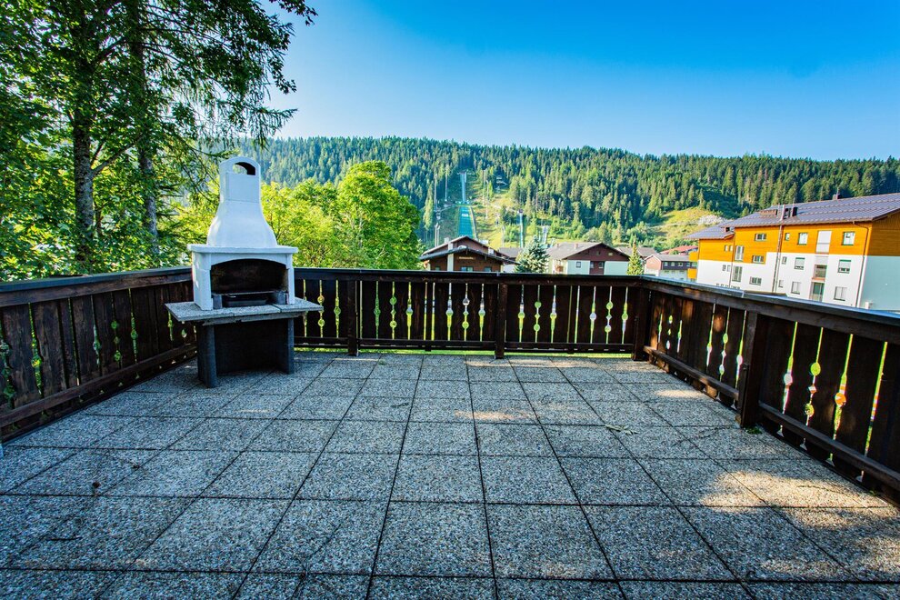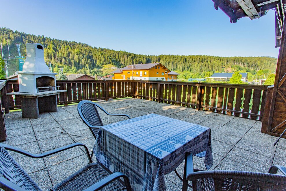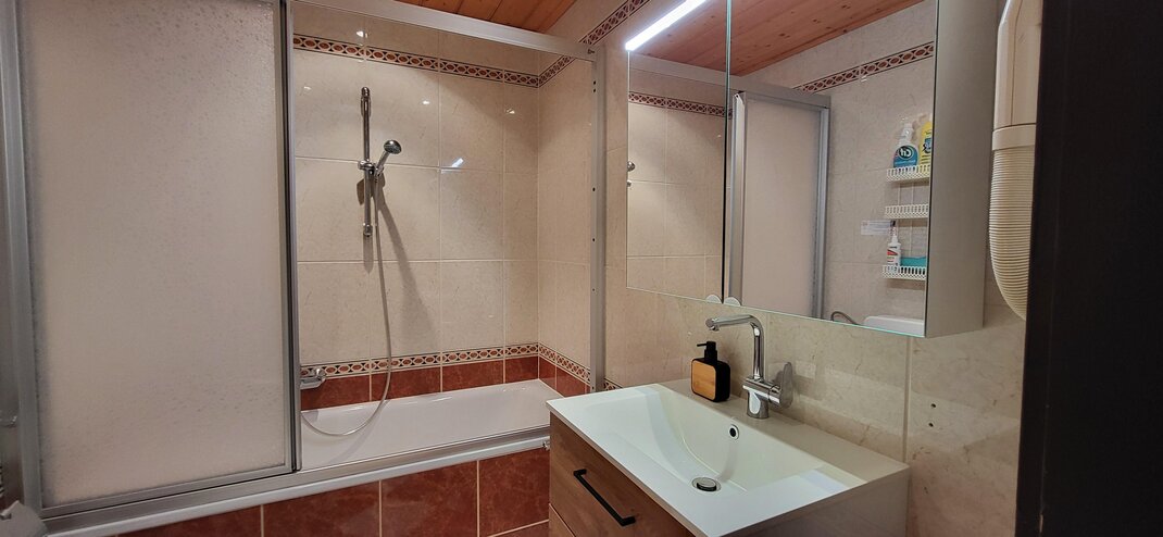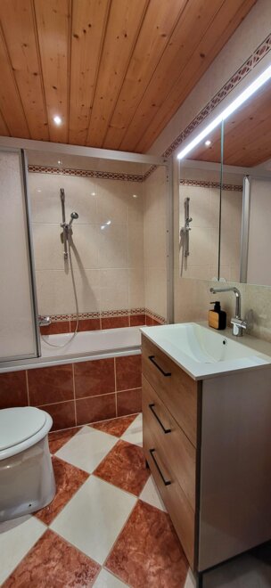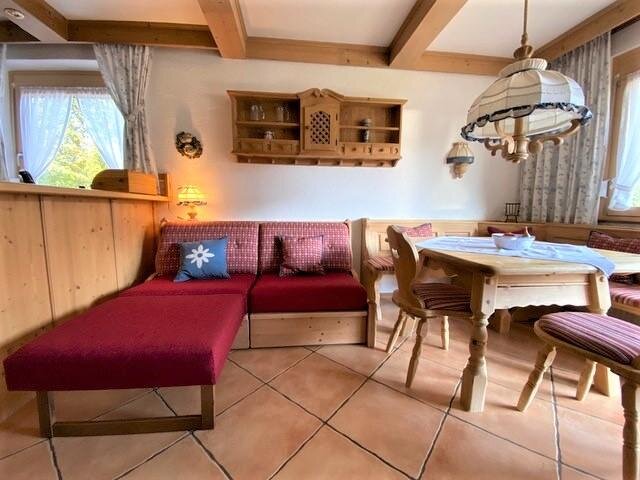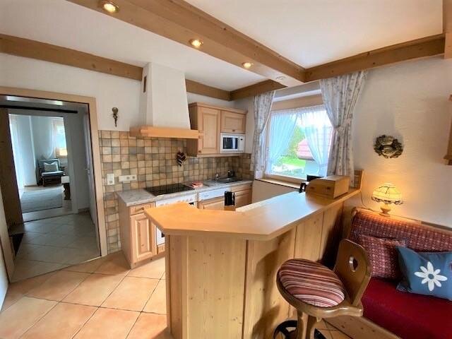 With a size of approx. 47m², a bedroom, a bathroom and a kitchen-living room with a pull-out couch, it offers space for a total of 4 people. The kitchen offers everything to prepare a good meal for your loved ones and you can enjoy it at the large dining table next to the tiled stove.
