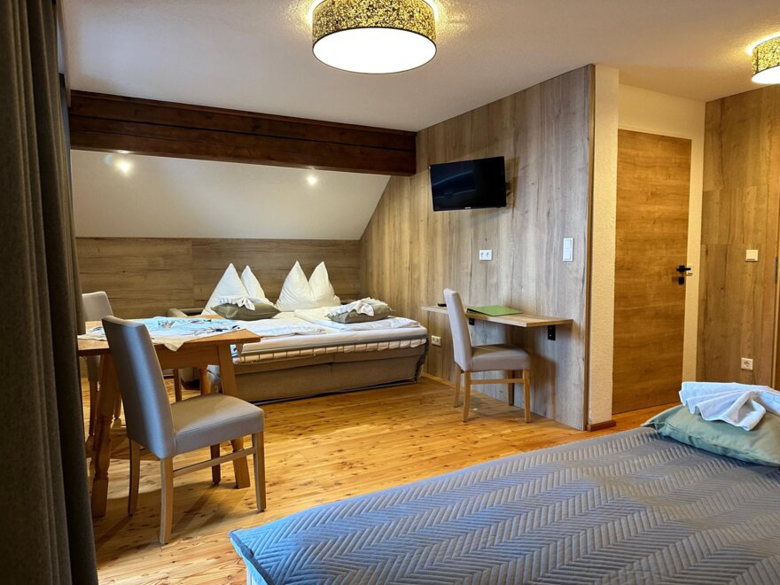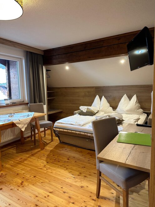 The carefully decorated rooms all have private bathrooms as well as a sitting area with a coffee maker where you find enough space for a get-together. From the balcony, you enjoy a wonderful view to our great garden, to the Schladming Tauern, and the fantastic backdrop of the Dachstein mountains.