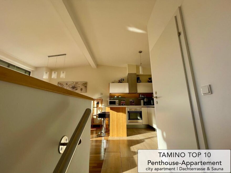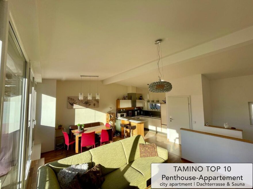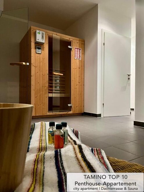 bedding, dish sink, oven, freezer compartment, anteroom, private entry, electric stove, essentials (towels, bed linen, soap, toilet tissue), central heating, no pets allowed, no carpet, terrace, cable TV, cooking possibilities, WiFi, refrigerator, sauna, vent hood, kettle, furniture suite, dishes available, separate bedroom/living room, good as new room/apt., open plan kitchen/living room, separate living room, family room/apt., non-smoking room/apt., kitchen, wooden or parquet floor, dishwasher, hairdryer, balcony furniture, luxurious furnishing, refrigerators available, microwave, closet, modern furnishing, balcony, coffeemaker, separate bedroom/s: 2