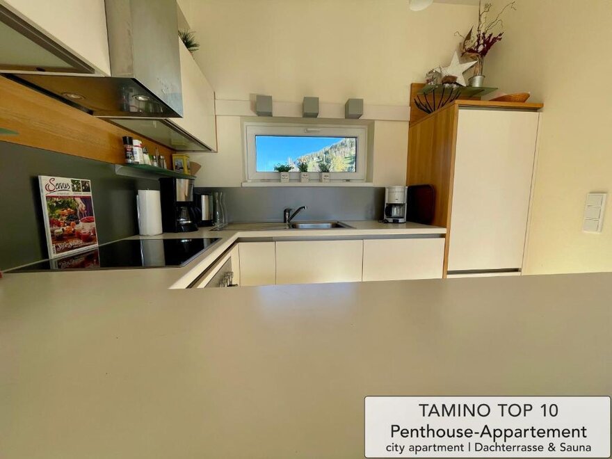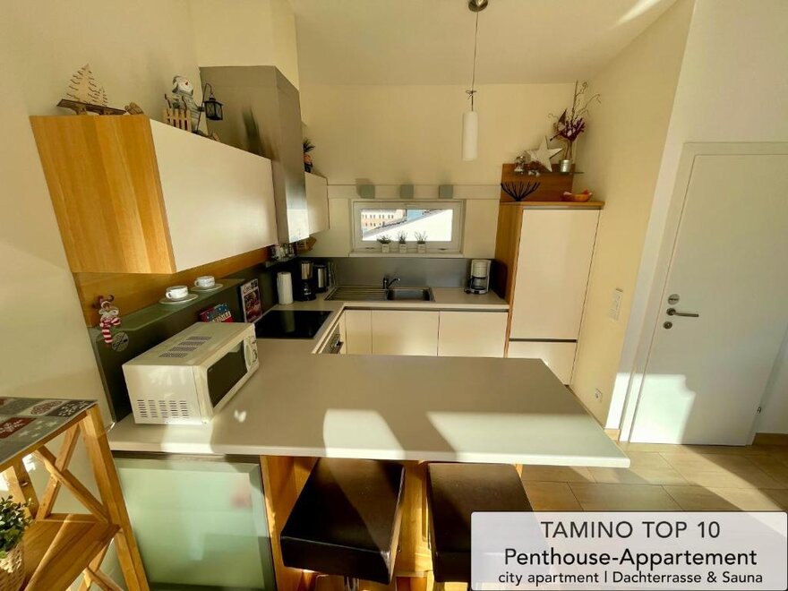 The kitchen is equipped with all modern technical appliances (refrigerator, freezer, cooker, microwave, kettle, coffee maker, etc.) of today - for a quick snack in between, you are welcome to take a seat at the bar element with its stylish bar stools, extensive meals together can be enjoyed with a view of the mountains at the cosy dining table. In addition, there is also a cosy sofa with TV in the spacious living area - so nothing stands in the way of a comfortable TV evening.