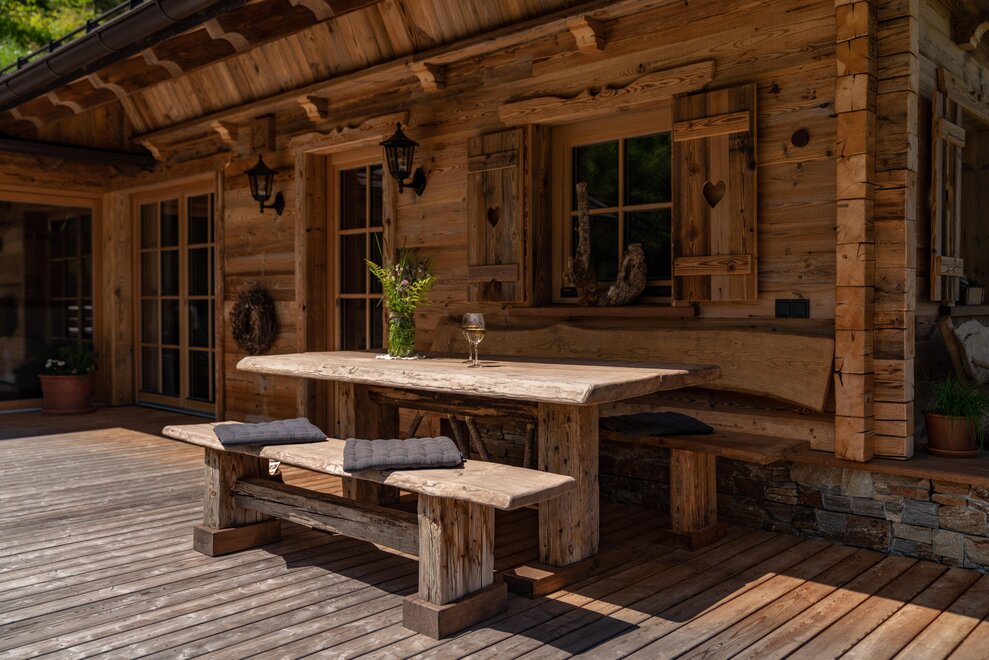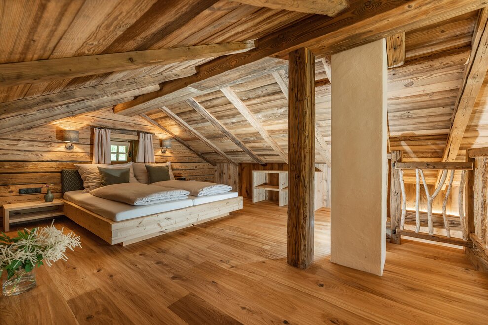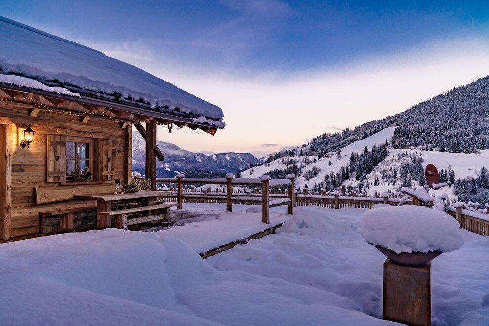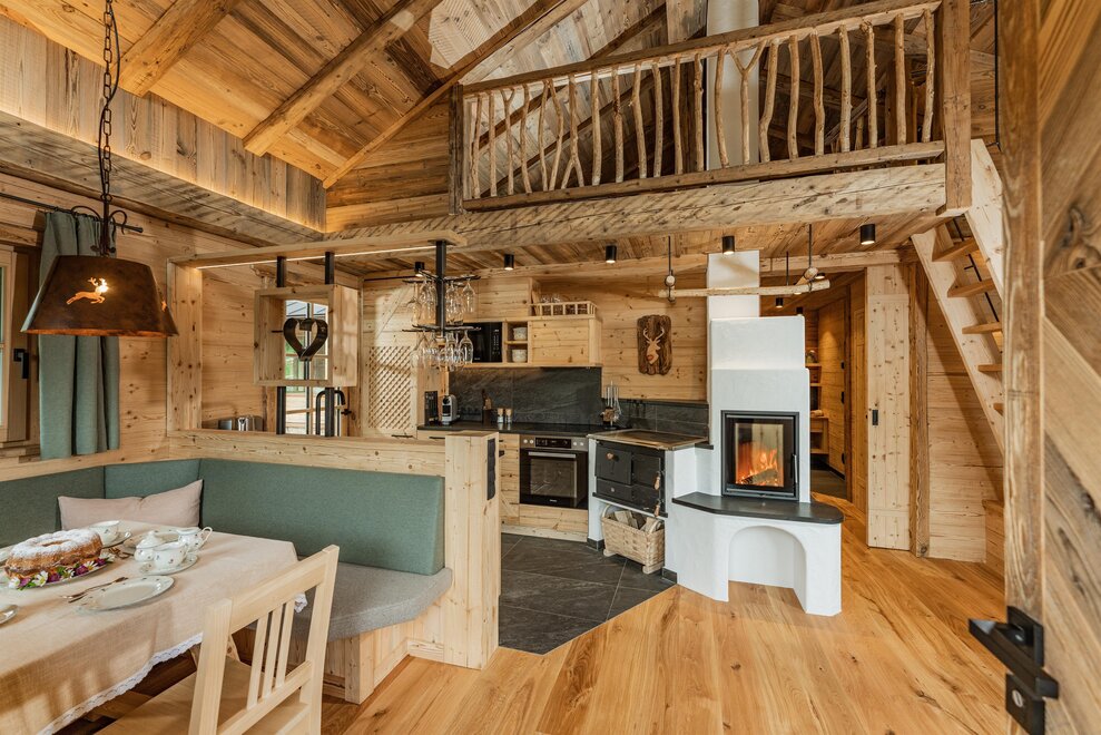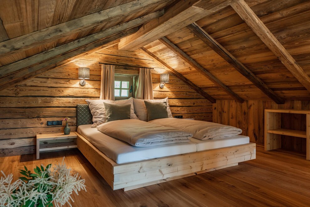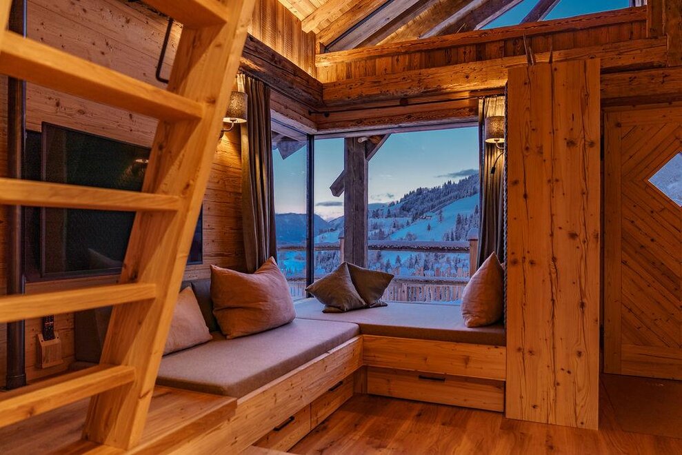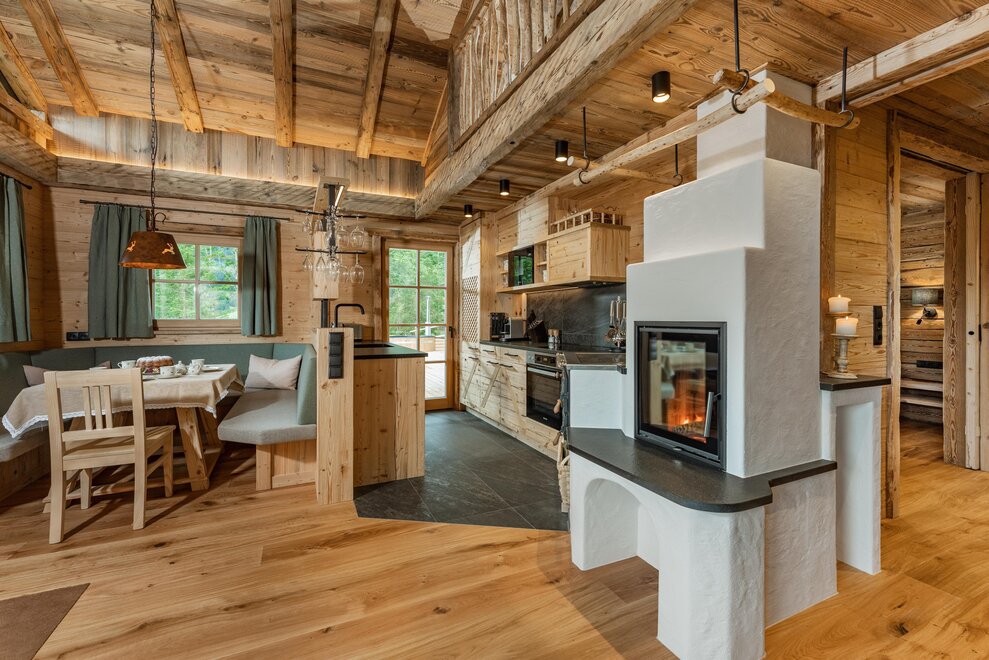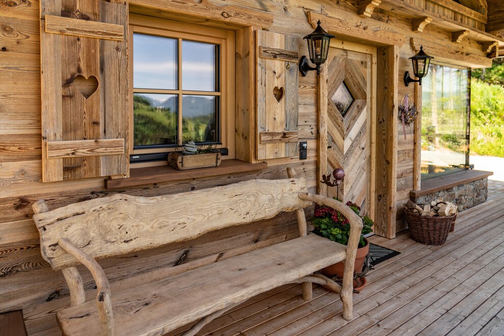The warm wood of the rooms, cozy loden fabric, and calming stone are a delight for tired eyes and mind. The natural smell of old wood in the Chalet Alm and the rustic furnishings contribute greatly to relaxation. It is wonderfully cozy to look out the large windows towards the mountains, listen to the crackling of the fireplace, and watch the snow crystals sparkle in the winter sun.