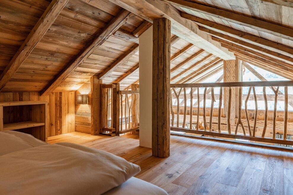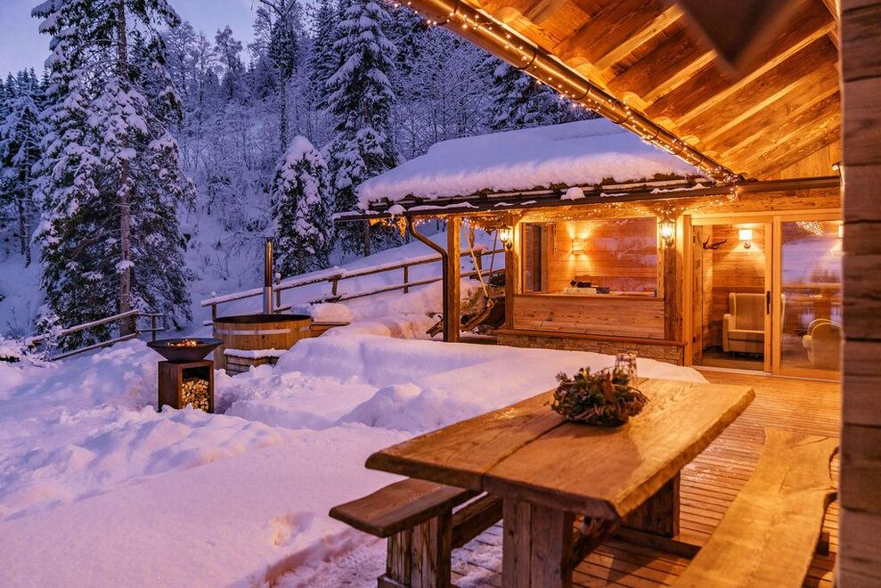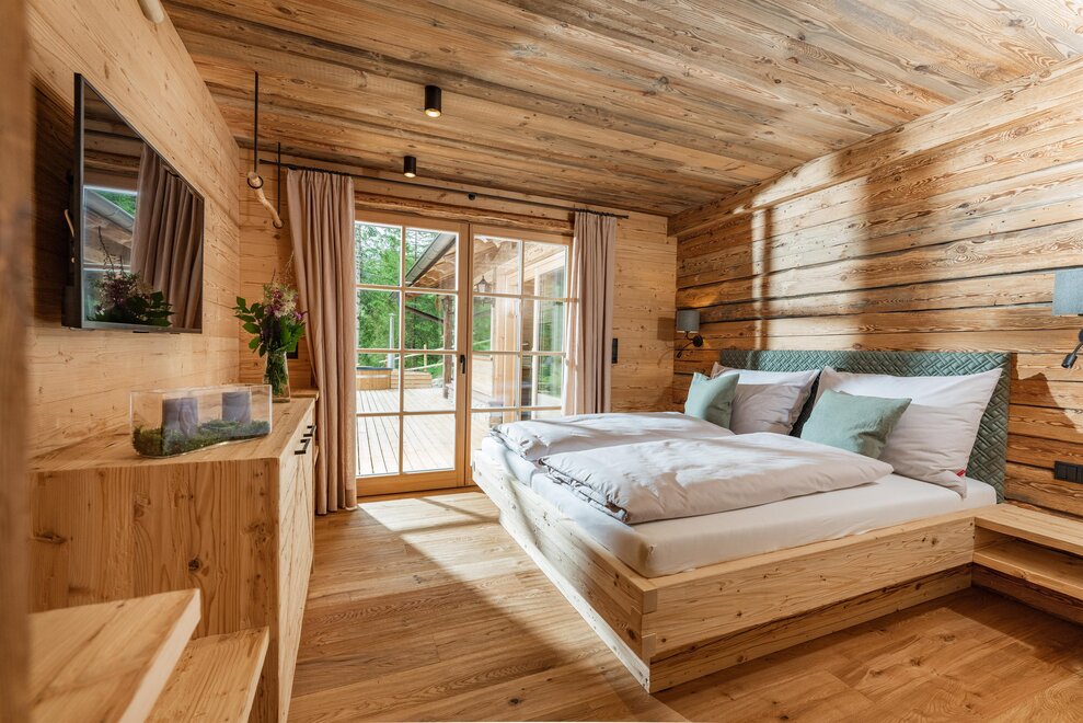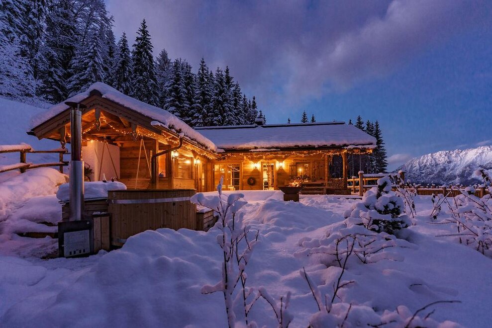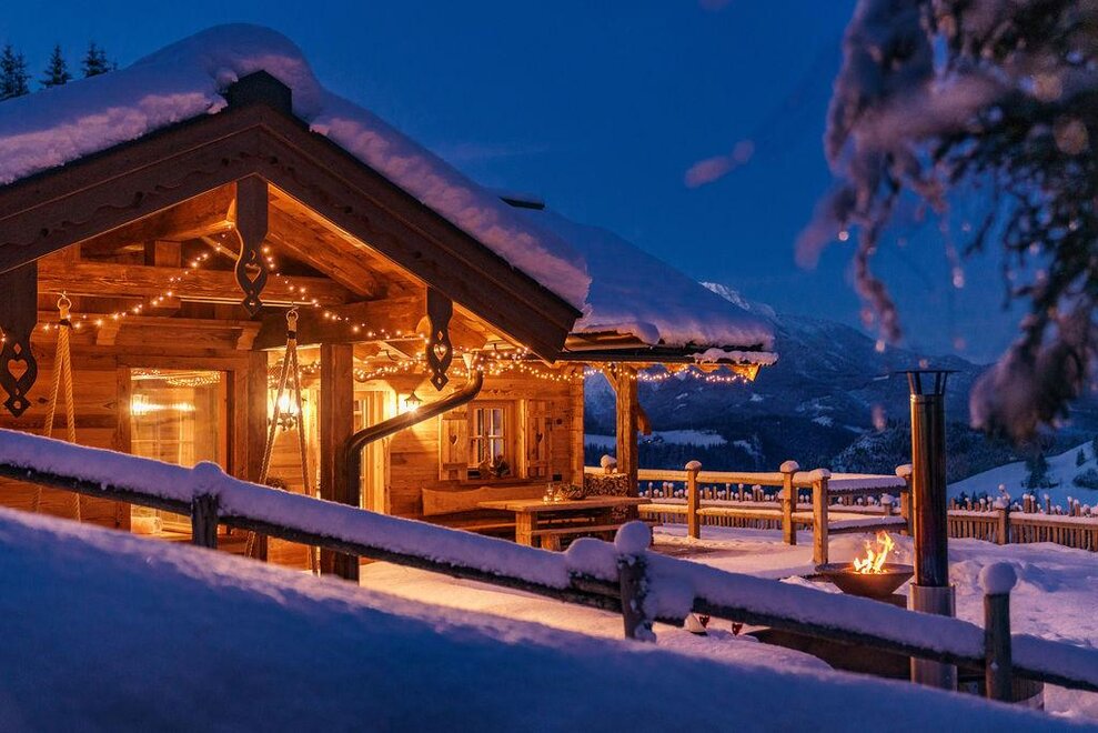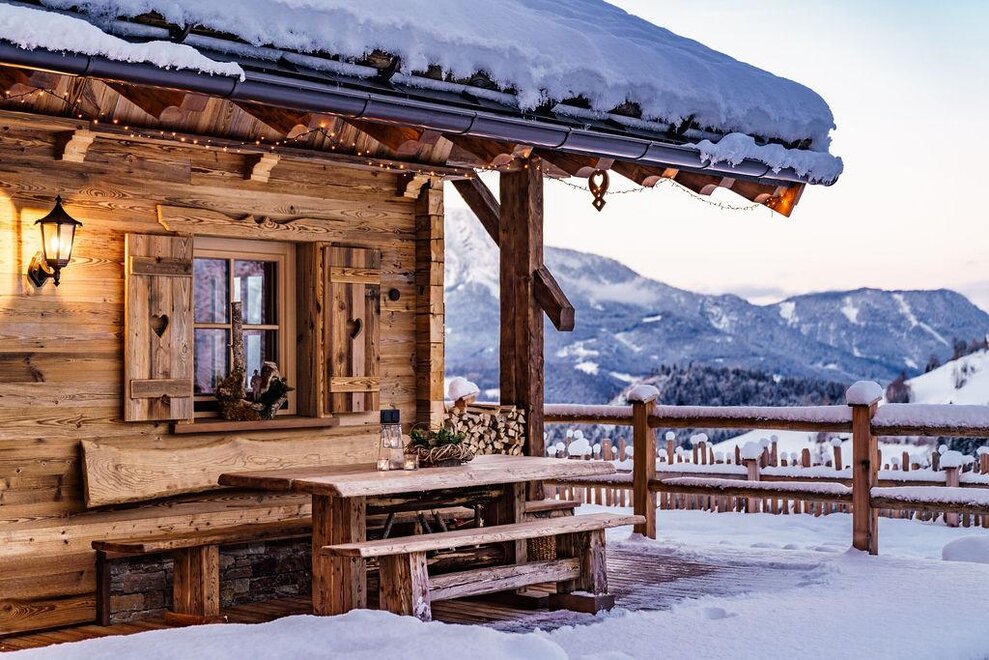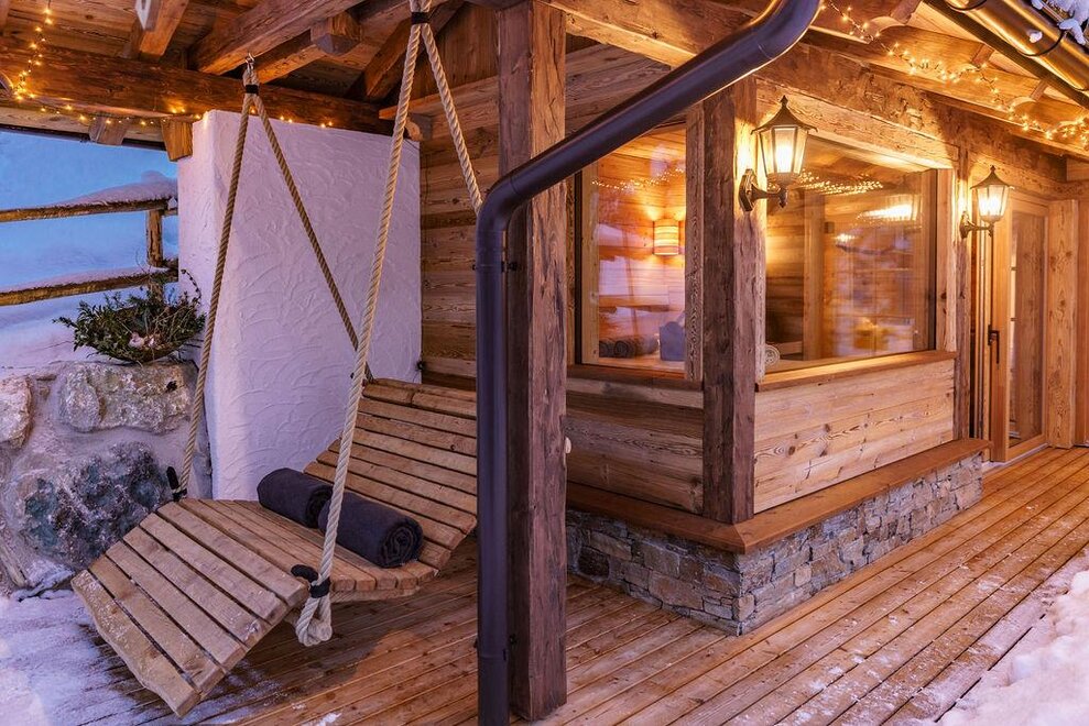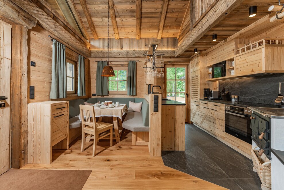 The warm wood of the rooms, cozy loden fabric, and calming stone are a delight for tired eyes and mind. The natural smell of old wood in the Chalet Alm and the rustic furnishings contribute greatly to relaxation. It is wonderfully cozy to look out the large windows towards the mountains, listen to the crackling of the fireplace, and watch the snow crystals sparkle in the winter sun.