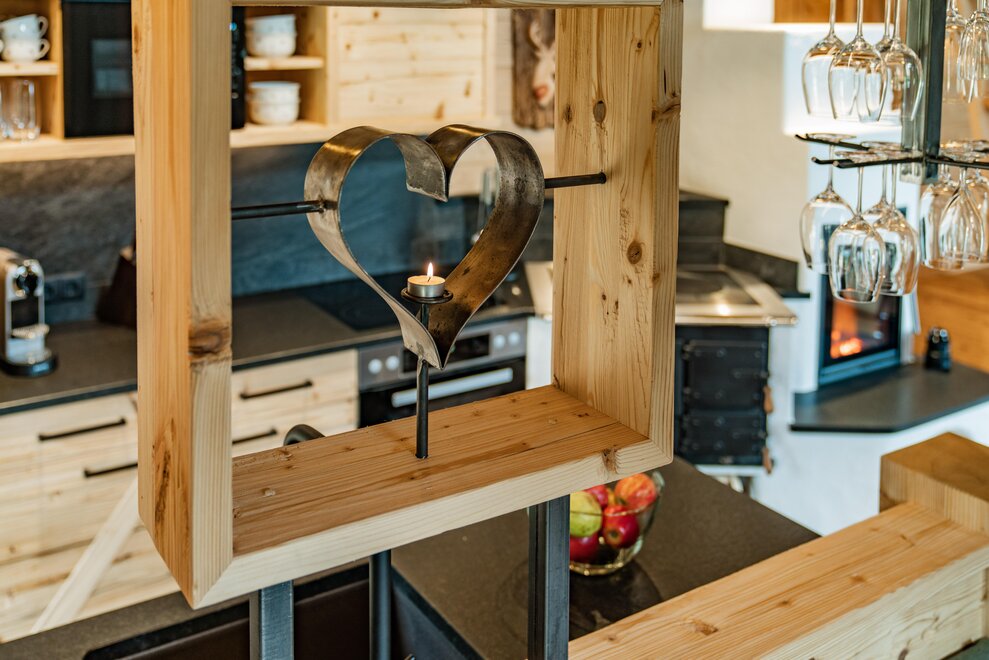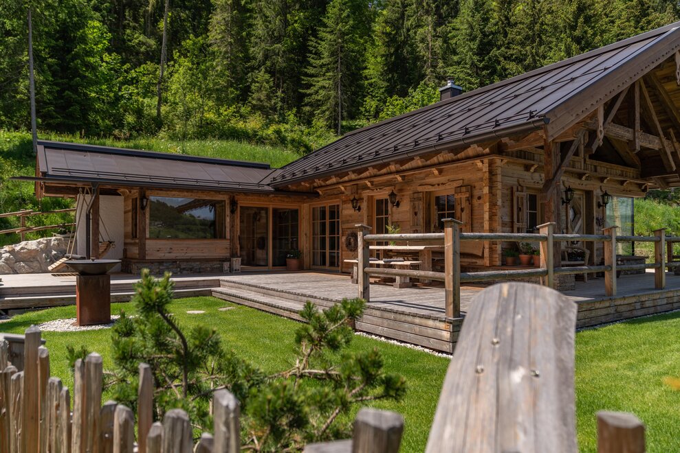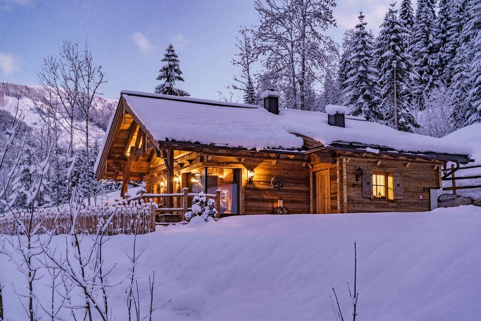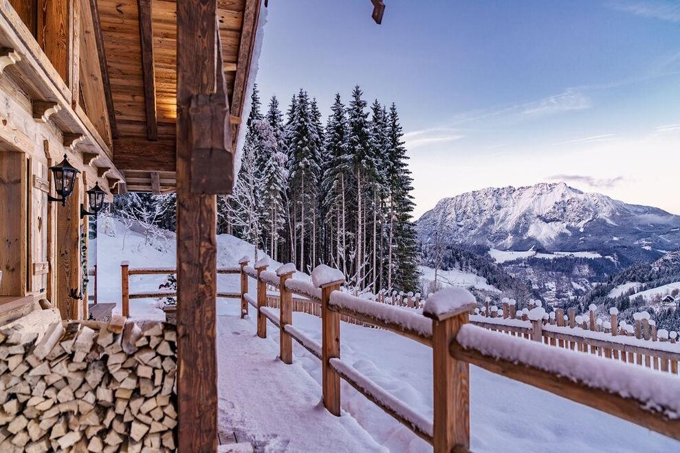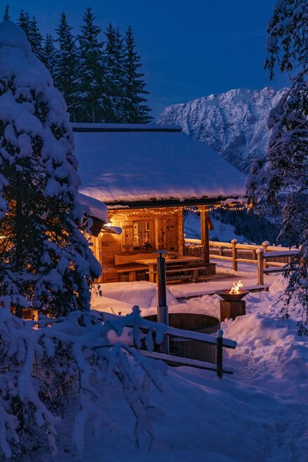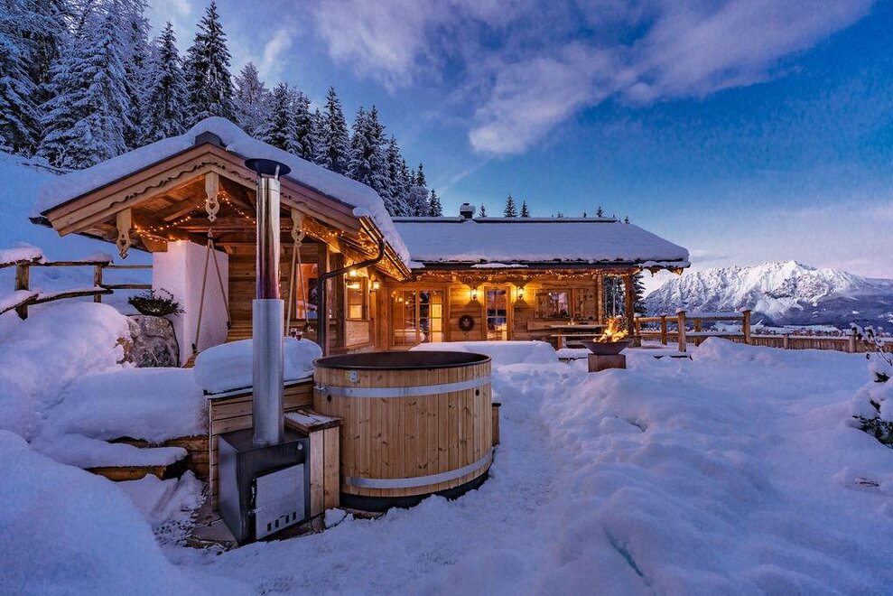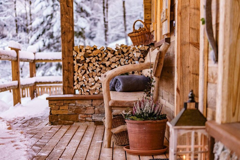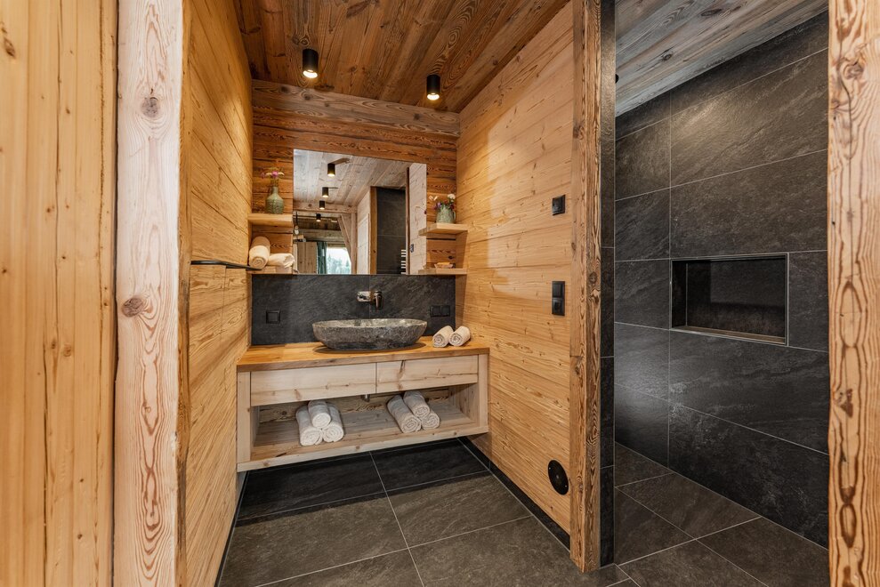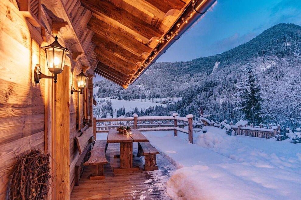The warm wood of the rooms, cozy loden fabric, and calming stone are a delight for tired eyes and mind. The natural smell of old wood in the Chalet Alm and the rustic furnishings contribute greatly to relaxation. It is wonderfully cozy to look out the large windows towards the mountains, listen to the crackling of the fireplace, and watch the snow crystals sparkle in the winter sun.