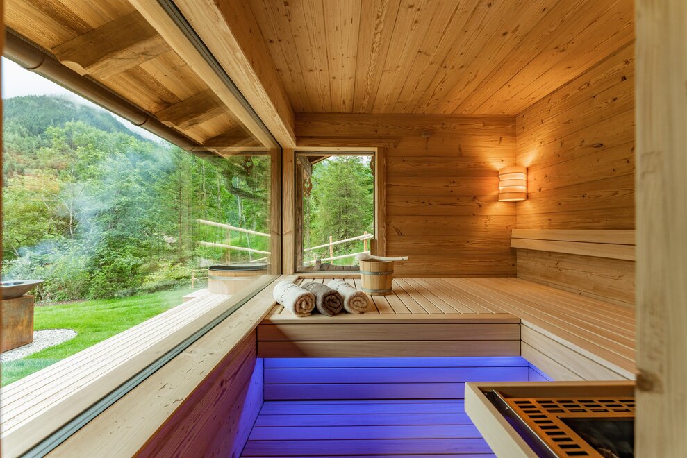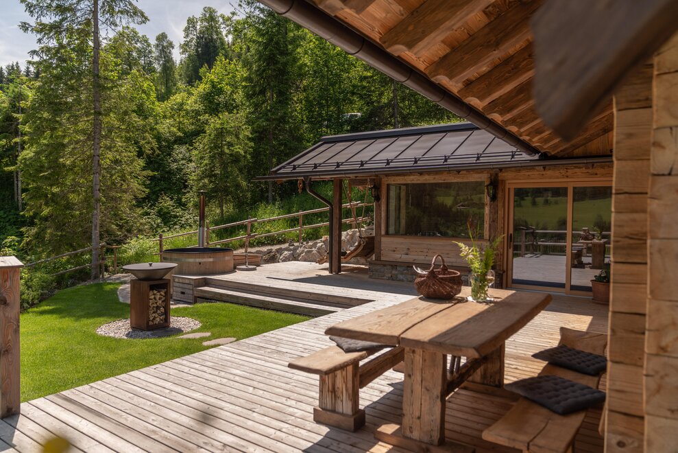 In the garden of the chalet, one can effortlessly leave modern life behind, where after a sauna session, one can dive into the refreshing water of the wooden pool, let the soul dangle in the basket swing, or find a sunny spot on the lawn.