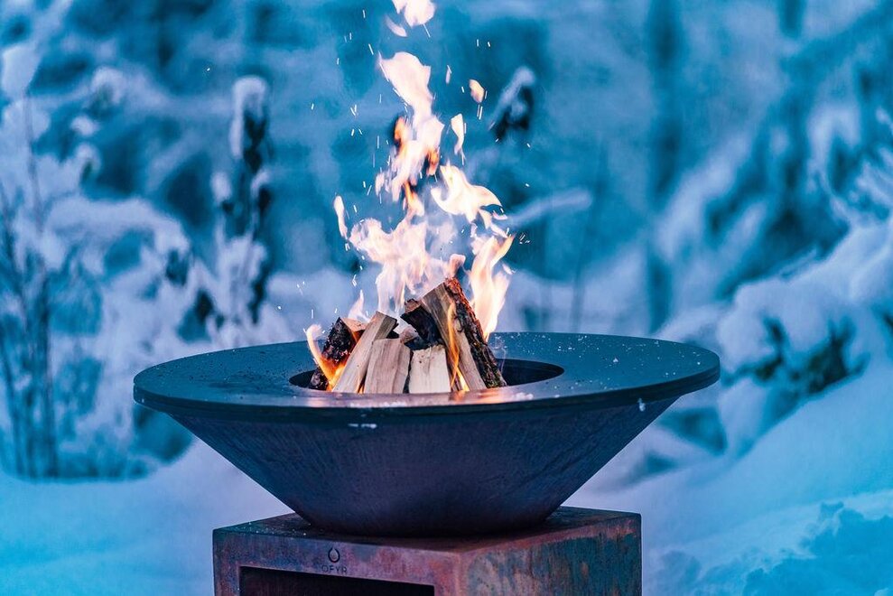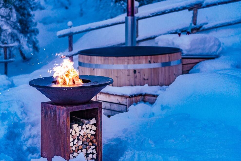 Sauna, hot tub / wooden water basin, and fire bowl