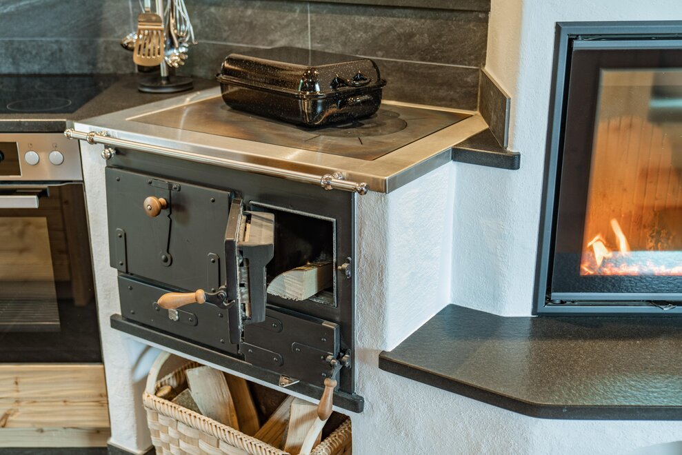 Kitchen with electric stove, oven, wood stove, refrigerator with freezer compartment, dishwasher,