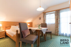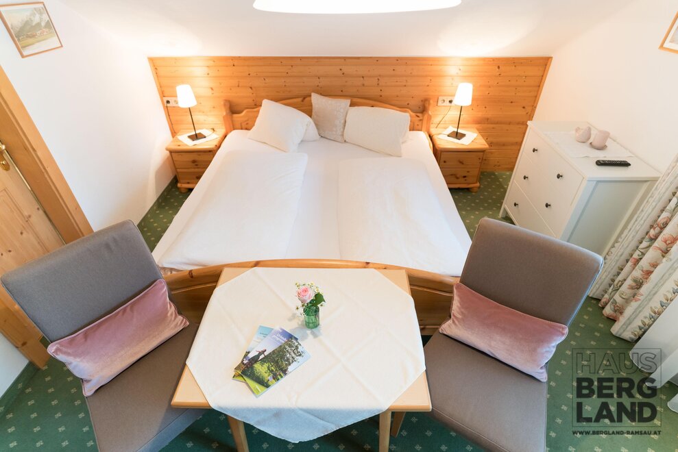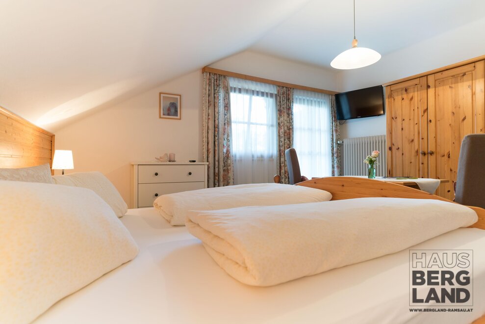 Our Haus Bergland lies directly in the centre of the Ramsau am Dachstein holiday region. Come and stay with us in one of Austria’s most beautiful areas. With the breath-taking Dachstein mountains on the doorstep, the blue skies above, and the lush green meadows beneath your feet, yours will be a dream holiday in Ramsau am Dachstein. Peppered with many rustic mountain huts waiting for you to stop by, Ramsau’s alpine pastures at 1,700 m and the Dachstein glacier at 2,700 m offer numerous via ferratas in summer, and, in winter, cross-country trails, ski runs, ski touring and winter walks. Nearby, you can find Kali’s ski runs, cross-country trails, walking paths, bus and ski-bus stops, ski schools, the public indoor pool with sauna facilities, shops, banks, and the doctor’s surgery, making us the perfect place for your base camp. Also very close to Haus Bergland is Ramsau’s cross-country stadium, which is the ideal starting point for the large network of trails. All rooms have a south-facing balcony, giving you plenty of sunlight. In front of the house are private parking spaces and a bike room. In the mornings, a delightful breakfast table in the cosy common room awaits you. The Ramsau plateau at 1,200 metres offers a large selection of walking paths, mountain-bike tours, Nordic-walking routes, cross-country trails, snowshoeing, and ski tours. Stop by Ramsau Beach, a swimming lake that also has an e-motocross park, a high-ropes course, and a summer toboggan run on the Rittisberg. For all those who love festivals and cultural events, there are many to choose from in Ramsau am Dachstein and the entire Schladming-Dachstein region. Your hosts, the Schrempf family, are looking forward to seeing you at the Frühstückspension Bergland B & B.