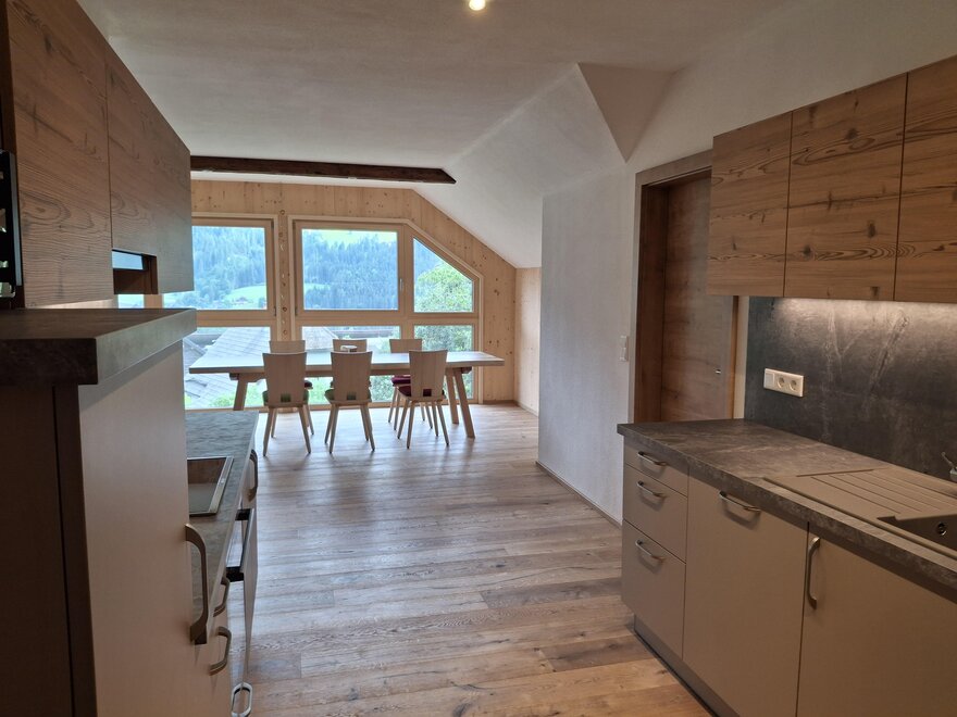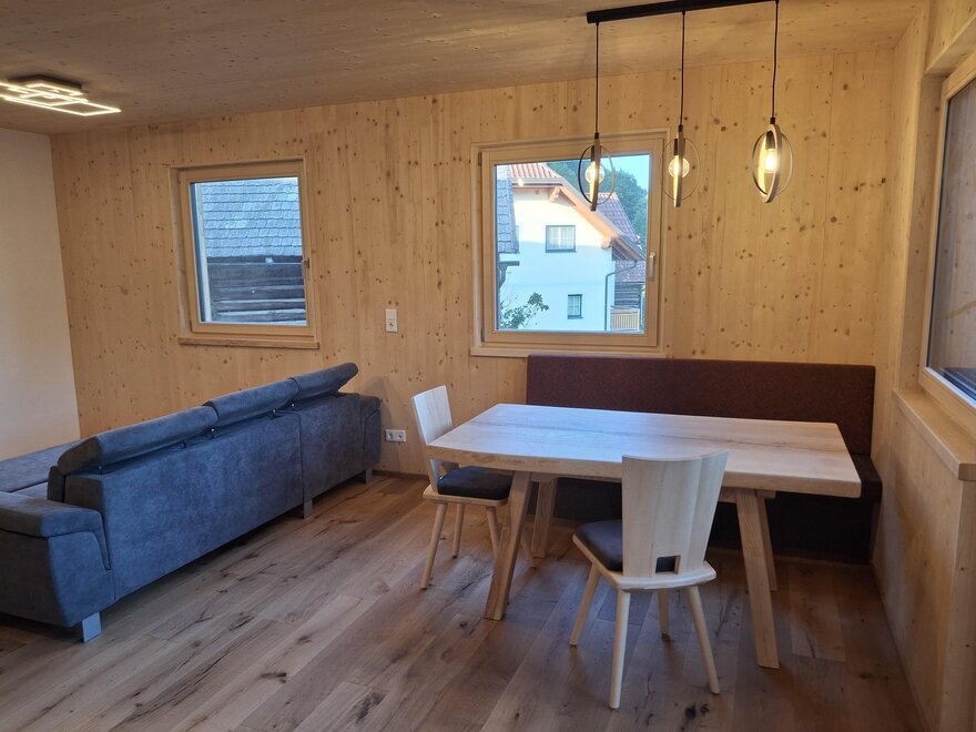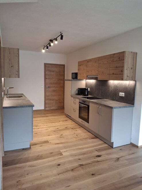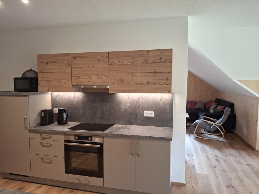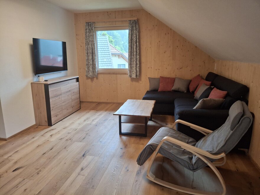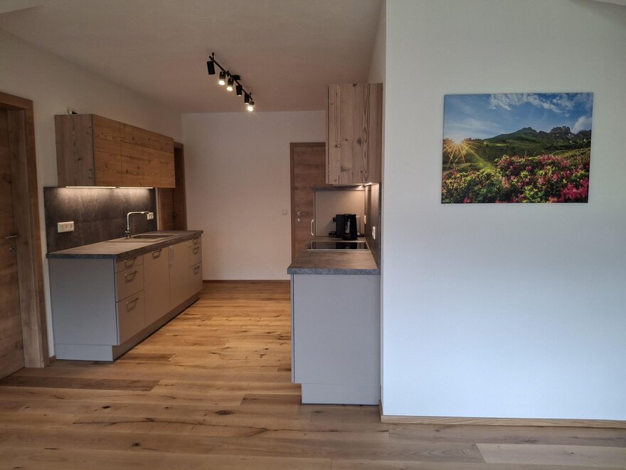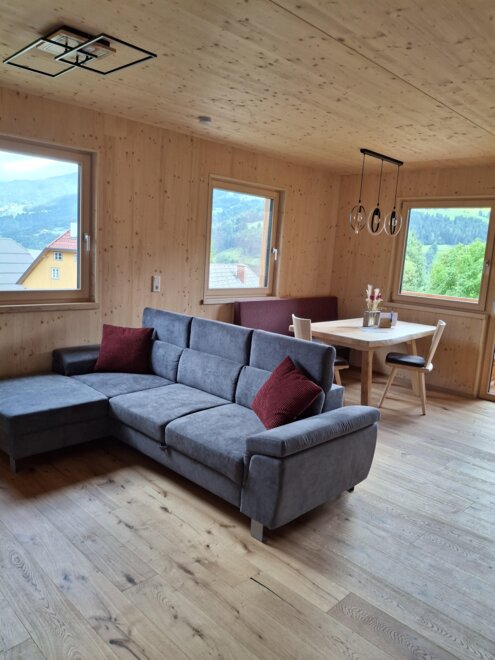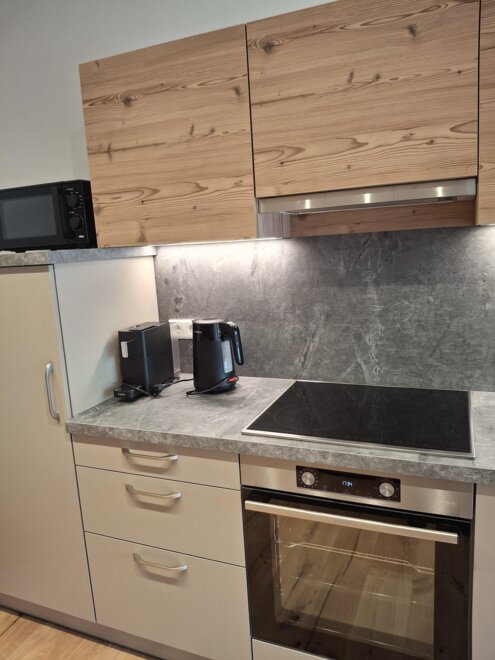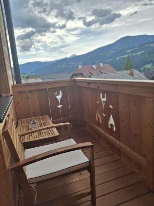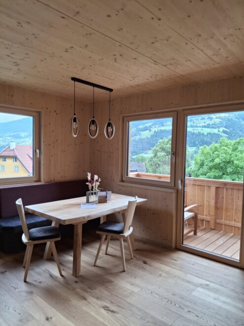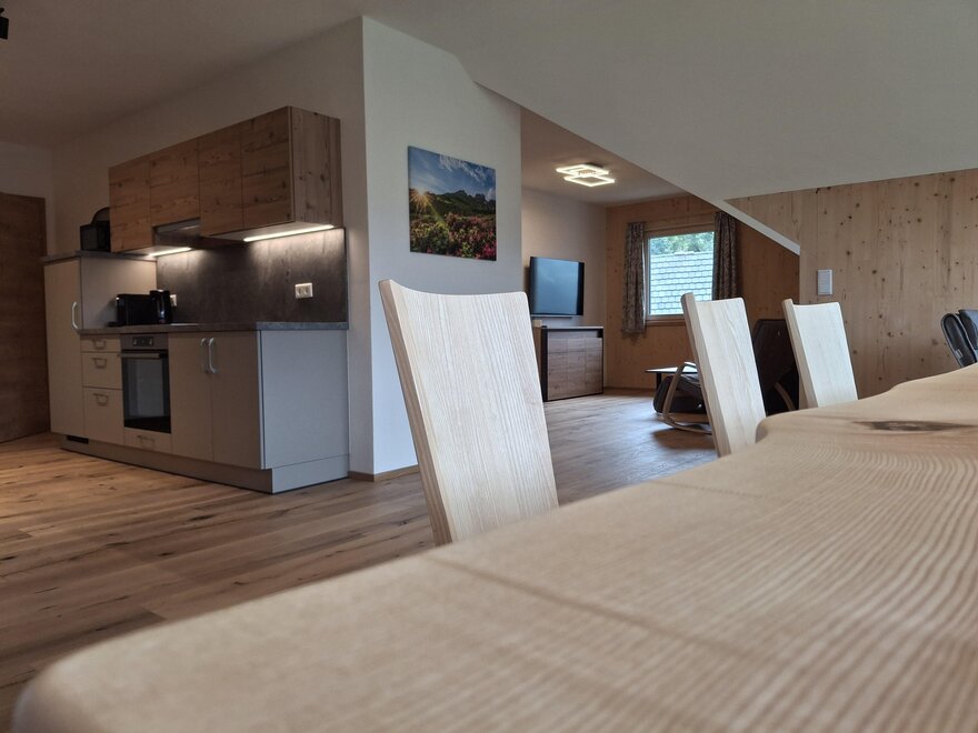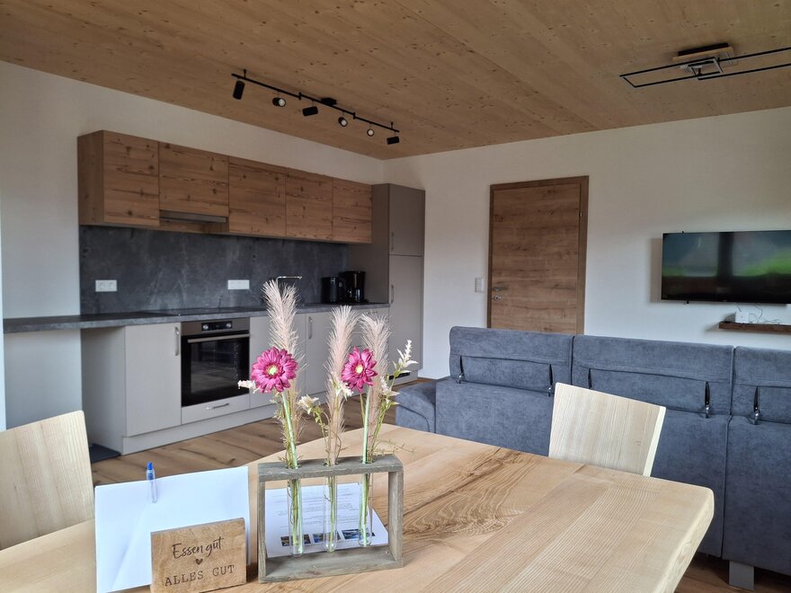 The Bergblick apartment offers 62 m² of space for 4 people. It features 2 cozy bedrooms (1x double bed, 2x single beds), a fully equipped kitchen-living room with a sofa, flat-screen TV, a modern dining table for 4 people, separate toilet and bathroom; enjoy the view from your private balcony.